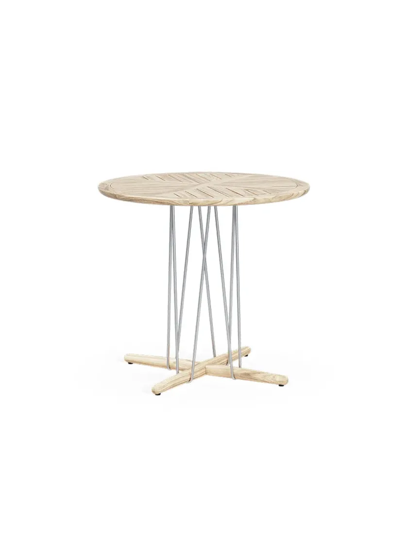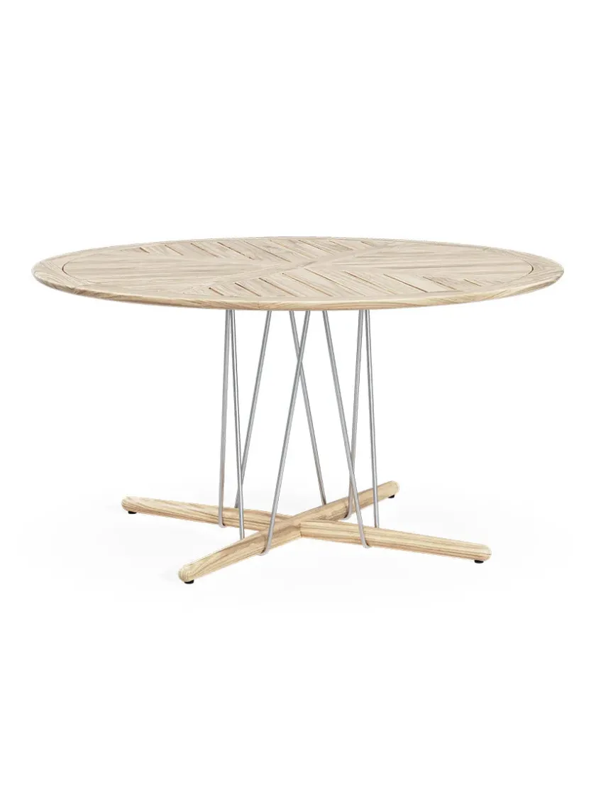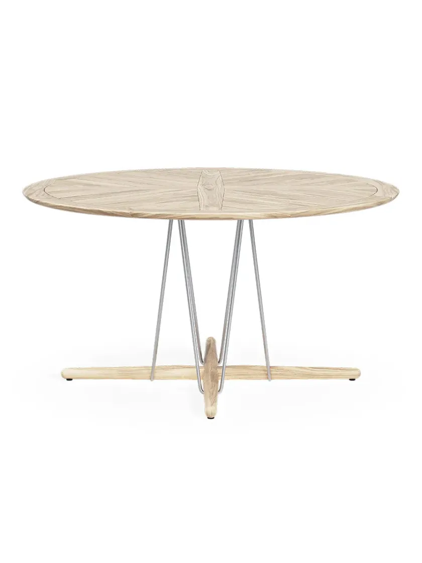 E022 Embrace havebordet er designet af den australske designtrio EOOS. Bordet har et dynamisk udseende med bordplade og fod i massivt, ubehandlet teaktræ og med stel i rustfrit stål. Det lette stel får bordpladen til at se næsten svævende ud, og det giver bordet en lethed. E022 havebordet måler 140 centimeter i diameter, og vil altså kunne rumme hele familien.
