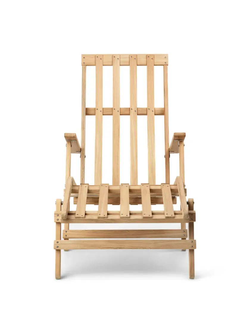 Børge Mogensen dækstol med tilhørende fodskammel fra Carl Hansen & Søn. Dækstolen BM5565 er inkl. hynde og er et pladsbesparende, sammenklappeligt funktionelt udendørs møbel, som indbyder til ren afslapning med en god siddekomfort i et let og elegant udtryk.