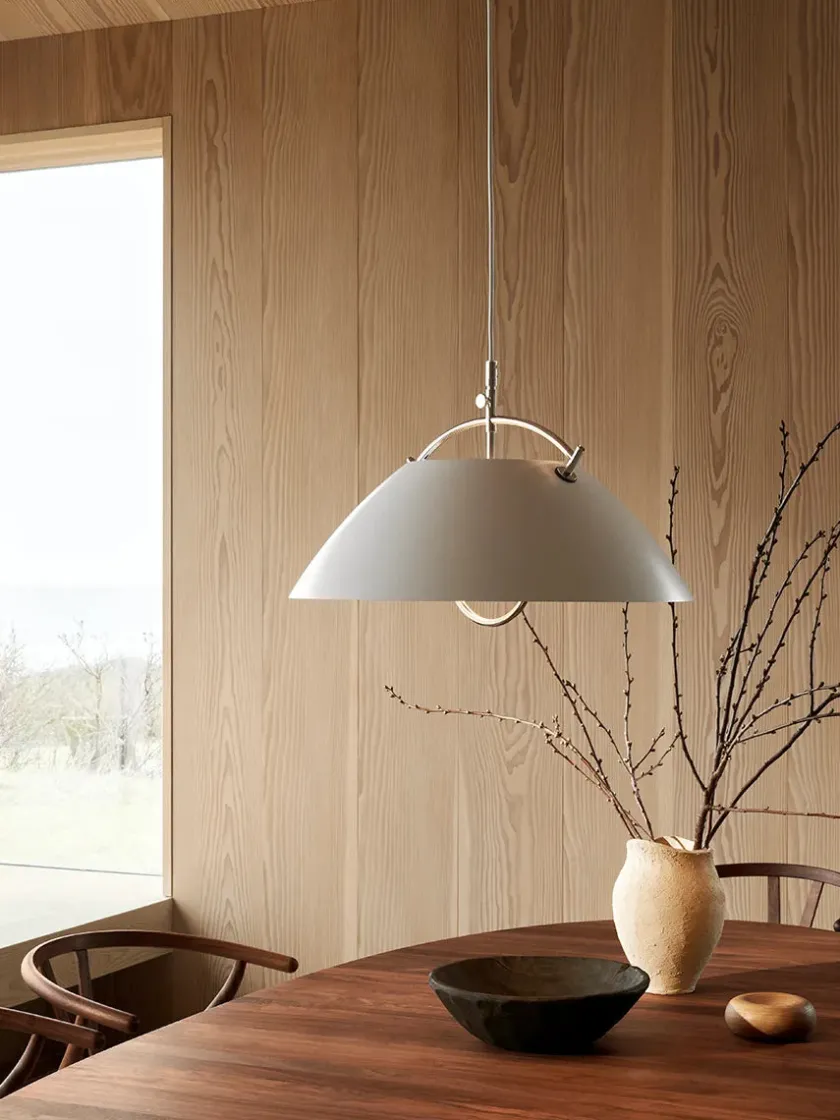 HJW37 Pendlen, også kaldet hejsependlen, er nu sat i produktion igen af Carl Hansen & Søn. HJW37 Hejsependlen blev designet i 1962 af Hans J. Wegner. Pendlen har en aluminiumsskærm med en 24-karat guld- eller forniklet bøjle, og den udsender et skønt og koncentreret lys. Hejsependlen kan fås med og uden lift/hejs – denne er med hejs, hvilket vil sige, at du selv kan justere højden på din lampe. Grundideen er en højdejusterbar lampe, hvor der i skærmen er et integreret ”håndtag”, som både er en bærende del af designet, og som gør det muligt at hejse lampen op og ned uden at røre ved selve skærmen.
