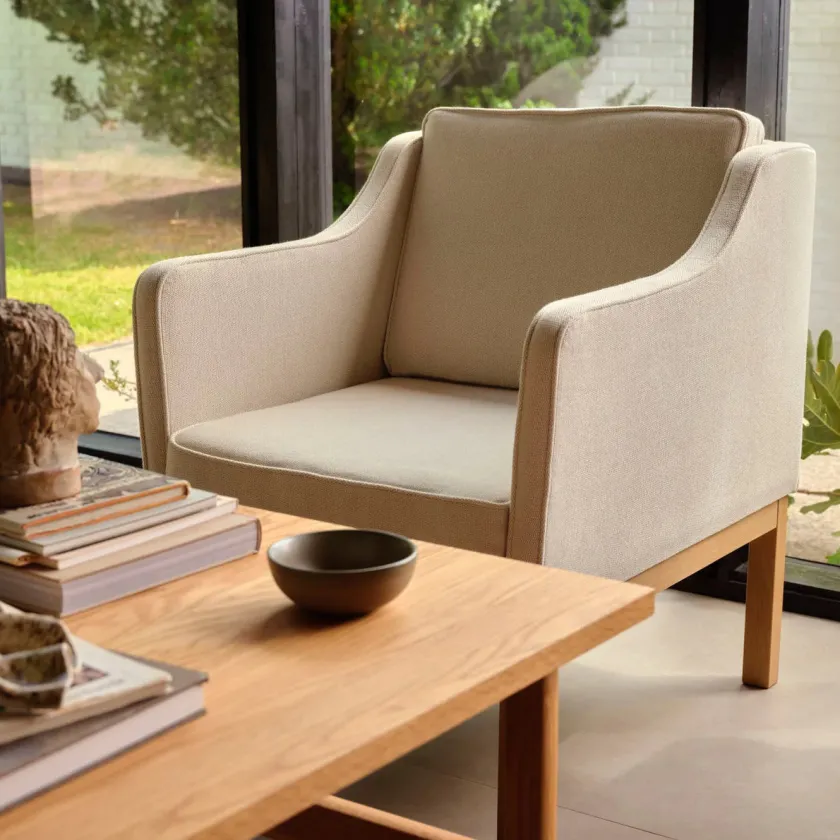 Mogens Kochs L46 MK155 lænestol kombinerer tidløs funktionalisme med moderne elegance. Med sit karakteristiske synlige træstel og bløde polstring i beige tekstil fremstår stolen både enkel og indbydende. Designet i 1947 til Gammel Køgegaard er L46 MK155 et udtryk for Kochs kompromisløse tilgang til ærligt håndværk og lette, klare linjer – et møbel der med sin varme nuance og arkitektoniske tydelighed harmonerer med moderne hjem.