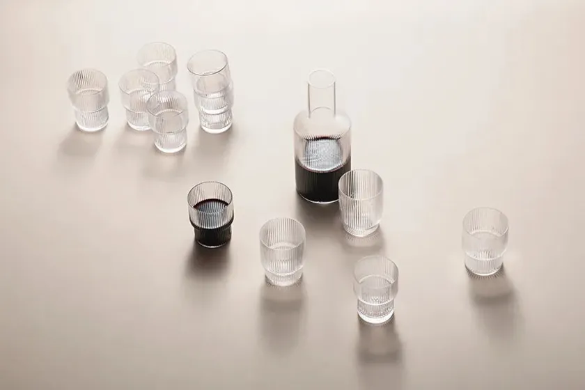Ripple glas fra Ferm Living. Leveres i sæt med 4 forskellige glas med riller. I serien findes der også en karaffel.