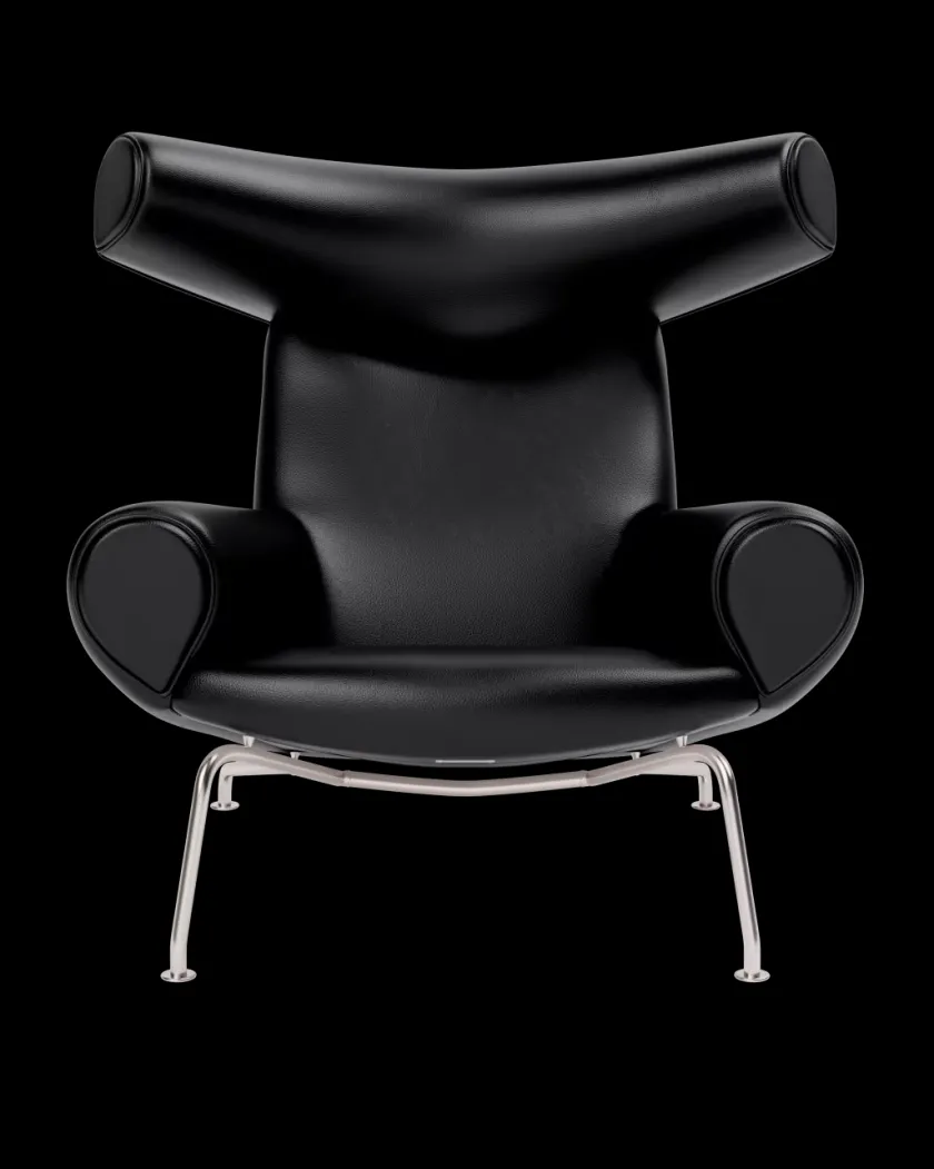 Wegner Ox Chair er et ikonisk mesterværk fra 1960, der udstråler styrke, karakter og raffineret komfort. Stolen er et monument over Hans J. Wegners mod til at eksperimentere med form og proportioner, og den fungerer som et skulpturelt statement i ethvert moderne hjem eller kontormiljø. De kraftfulde linjer og det generøse sæde inviterer til afslapning, mens den håndlavede kvalitet og de ædle materialer sikrer, at Ox Chair kun bliver smukkere med tiden. I denne version er stolen betrukket med eksklusivt sort Primo 88-læder, der med sin dybe farve og silkebløde overflade giver et sofistikeret udtryk. Det børstede rustfri stålstel fuldender designet med en elegant, industrielt inspireret kontrast, der fremhæver stolens ikoniske profil.