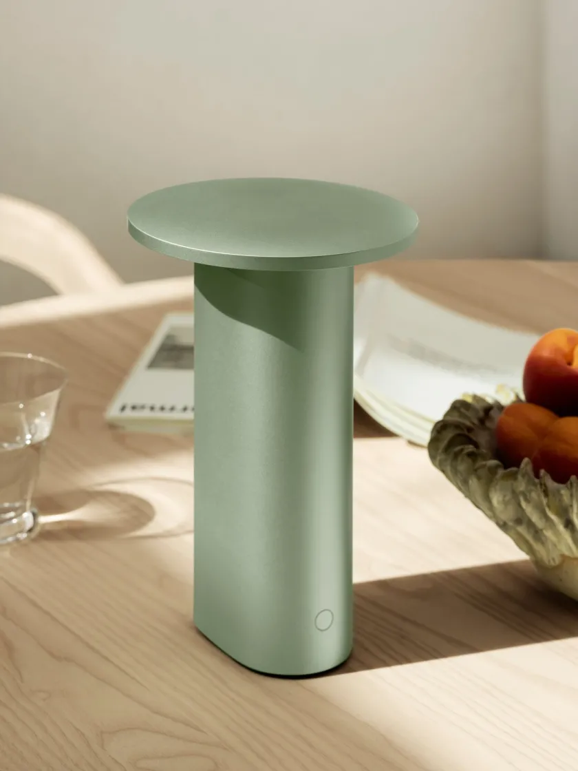 Lampens materialer er valgt med præcision og omtanke. Den fås i tre elegante varianter: anodiseret aluminium med grøn tone, varm grå og klassisk hvid med vådlakering. Den genopladelige funktion gør Solae robust og fleksibel – velegnet både ude og inde.
