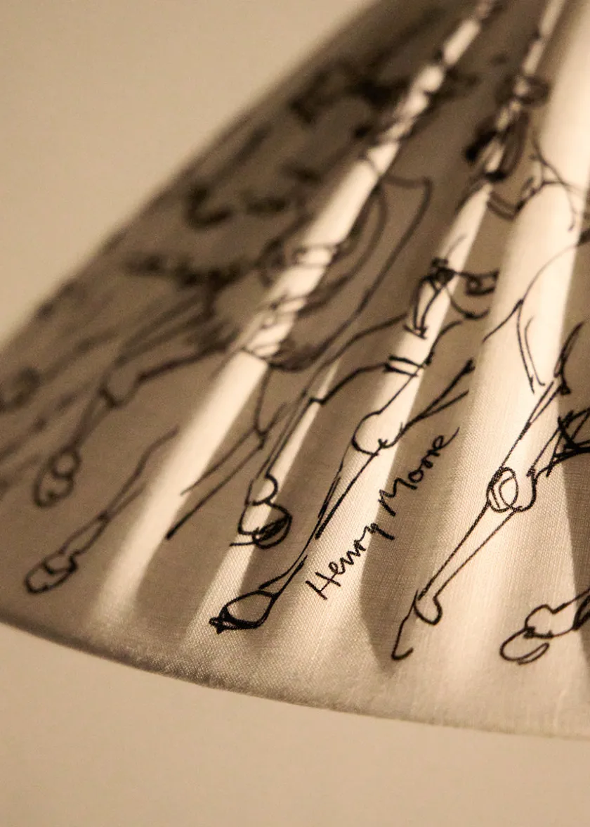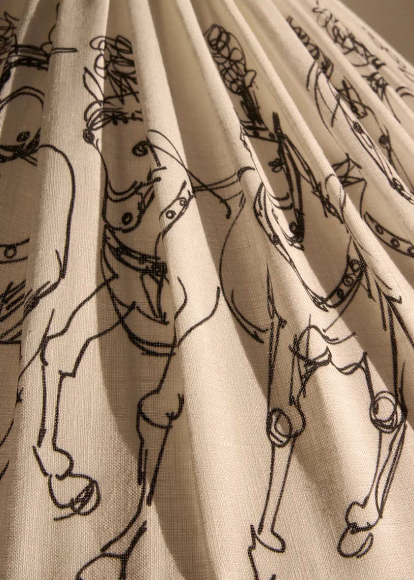 GUBI’s ikoniske 9602 gulvlampe er designet af Paavo Tynell. Lampen er kendetegnet ved sin brede, koniske skærm og den elegante rattanomviklede stang, her smukt afbalanceret af en poleret messingbase for et tidløst udtryk. I denne Garro Éditions specialudgave er skærmen med Henry Moores ‘Haringey Circus Horses’, som tilfører skulpturel dybde og et levende spil i foldene. Gulvlampen skaber et blidt og varmt lys. Perfekt som læselampe ved sofaen eller som skulpturel belysning i stuen, soveværelset eller entréen.