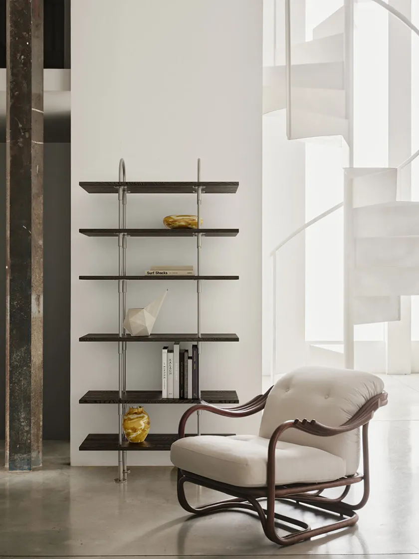 Poltrona Tria Lounge Chair forener rattanens naturlige skønhed med gennemtænkt ergonomi i et udtryk, der er både kunstnerisk og funktionelt. Rammen er skabt næsten udelukkende af dampbøjede rattanstænger, og samlet i hånden, så materialets varme glød og levende struktur kan træde frem. De karakteristiske, tredelte armlæn folder sig ud som elegante vinger og giver afslappet støtte, mens den lette ramme bevarer stolens luftige udtryk. To dybe hynder løfter komforten og giver kroppen behagelig støtte, mens den luftige konstruktion lader stolen indgå naturligt i stue, loungehjørne eller bibliotek. Et tidløst design af Carlo De Carli, nænsomt genskabt af GUBI med respekt for originalens ergonomi og med materialer, der bringer en anelse af udeliv ind i stuen.