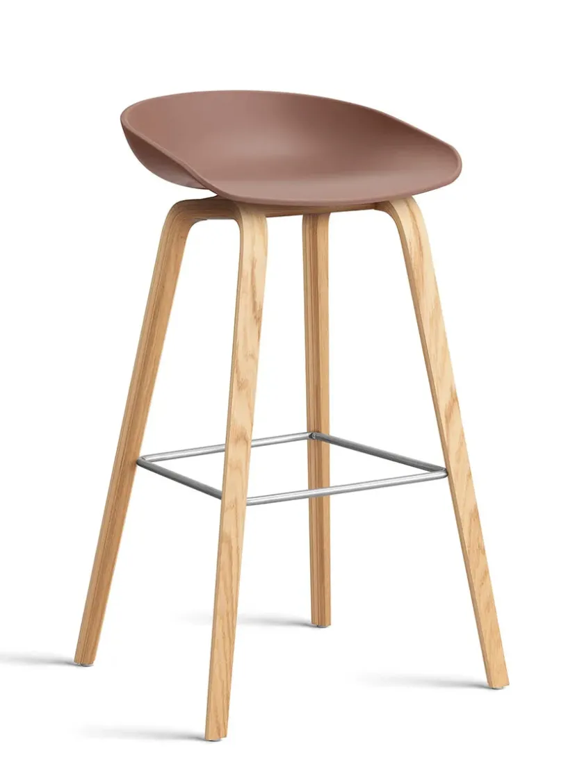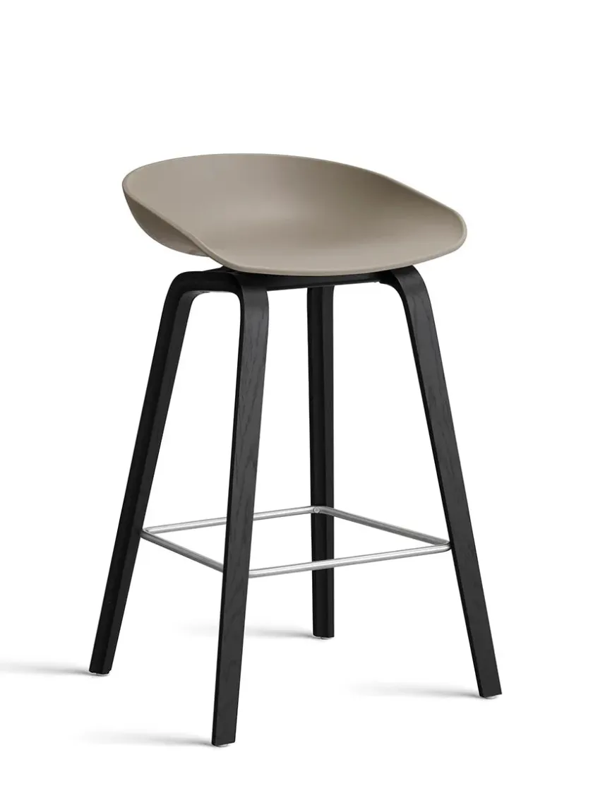 About a Stool (AAS33) fra Hay Barstol Designet af: Hee Welling & Hay Mål: Lav / B 50 x D 43 x H 64/75 cm Høj / B 50 x D 46 x H 74/85 cm Barstolen tilbydes i mange forskellige stof – og lædertyper. Se mere om dem under fanen “materialer”. OBS: Alle barstolene kommer med footrest i rustfrit stål. Det er også muligt at få stolen med sort footrest, kontakt os herom. Ben: Lakeret eg (vandbaseret lak) Sortbejdset eg (vandbaseret lak) Lakeret valnød (vandbaseret lak) Der er desværre ikke billeder af alle varianter.