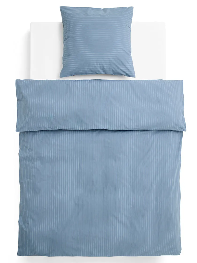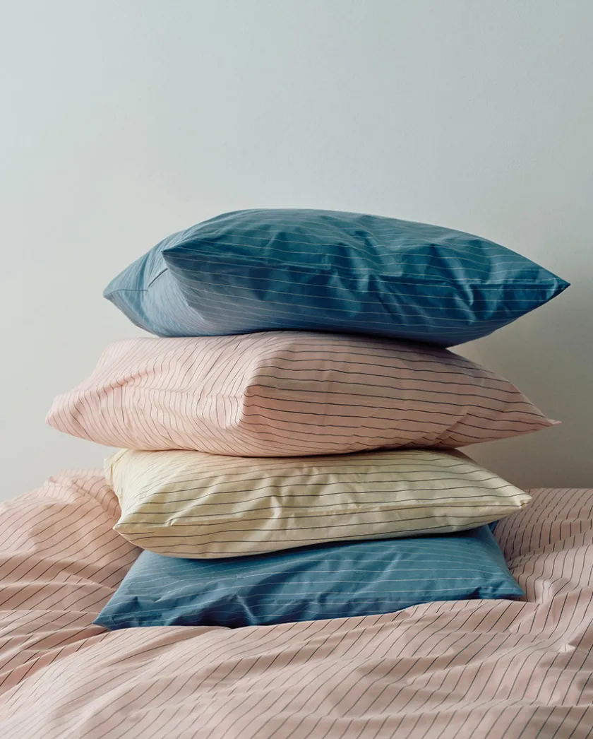 Fineline Pillow Case fra HAY er et elegant og tidløst pudebetræk, der kombinerer klassiske striber med blød, økologisk bomuld. Det er fremstillet i percalevævet bomuld, som føles sprød og kølig mod huden og giver en behagelig, frisk fornemmelse nat efter nat.