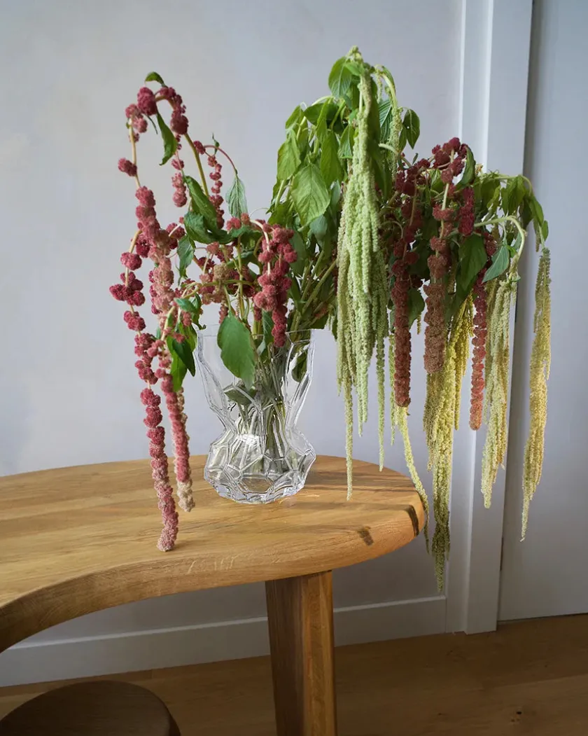 Reflection vasen fra Hein Studio er inspireret af iskolde schweiziske bjergfloder. Isen på floderne ses tydeligt i vasens design. Reflection vasen er mundblæst og af ét stort stykke gas. Vasen er flot både med og uden blomster og er et smukt element at bruge på spisebordet. Her er vasen i et smukt røgfarvet glas, der giver vasen personlighed.