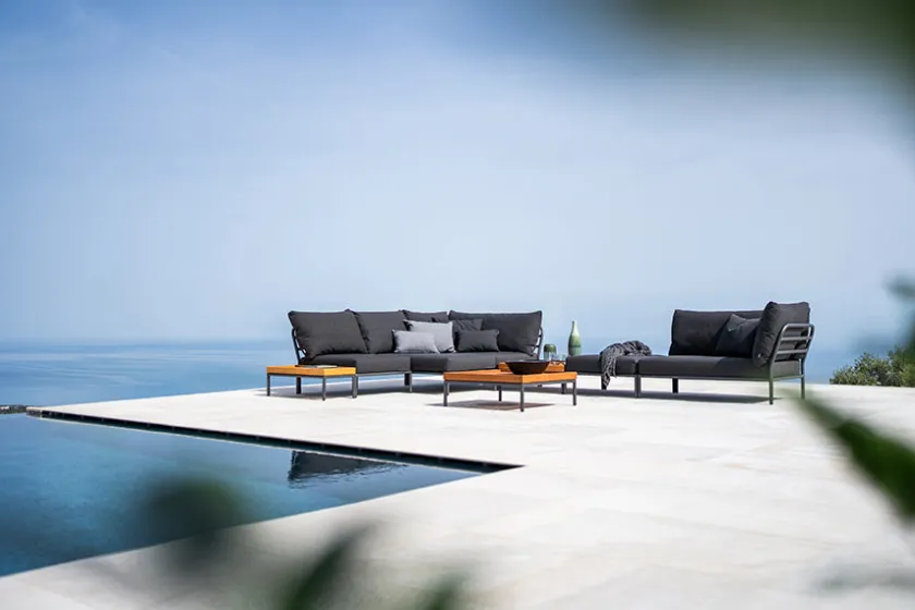 Level serien har fået et blødere look i Level 2-serien. Level 2 er i det slidstærke og modstandsdygtige Sunbrella Heritage tekstil. Varianten med Dark Grey hynde er betrukket med polyester. Brug Level 2 udedørs på din terrasse eller i haven som et luksuriøst loungeområde, hvor der kan slappes af og hygges. Level 2 serien er enkel og stilfuld i sit udtryk, og er opbygget af moduler.