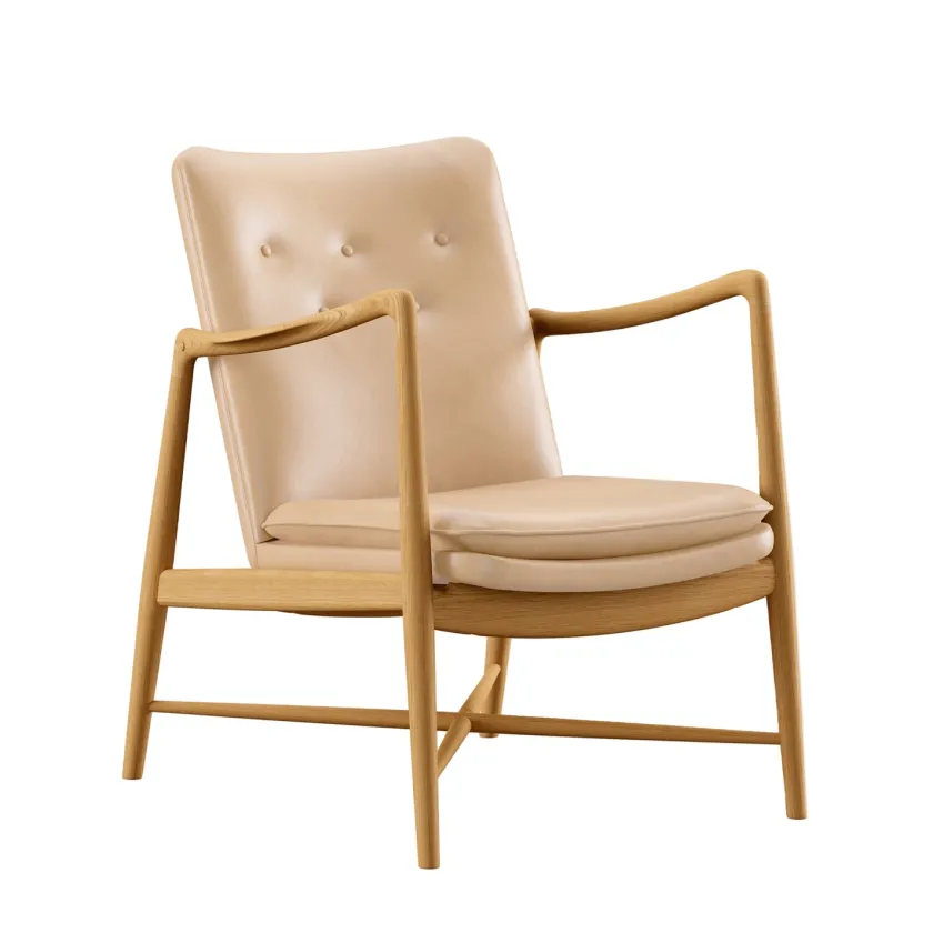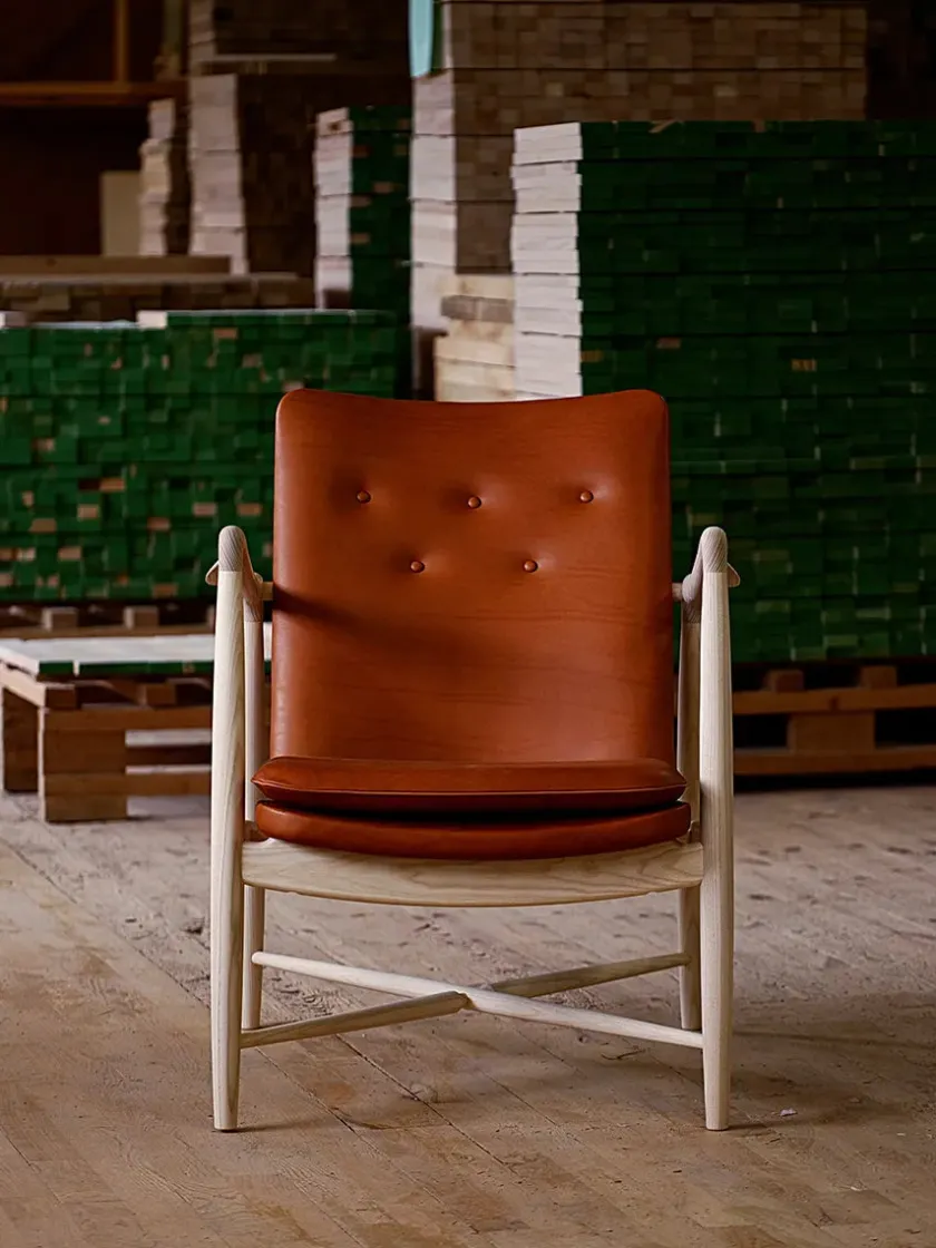 Fireplace Chair indfanger essensen af Finn Juhls organiske formsprog og inviterer til rolige stunder ved ildens skær. De svungne armlæn og den elegante krydsdetalje mellem benene giver stolen et let og skulpturelt udtryk, mens den generøse polstring leverer blød komfort uden at virke tung. Hver stol fremstilles med stor omhu, håndpolstret i Danmark i læder eller tekstil og båret af et massivt træstel i ask eg eller valnød. Resultatet er en tidløs lænestol der passer naturligt ind i både klassiske og moderne interiører og som med sin åbne silhuet bliver et varmt samlingspunkt i stuen.