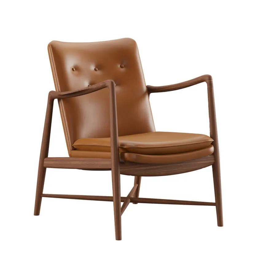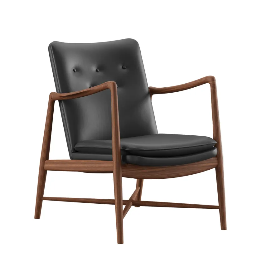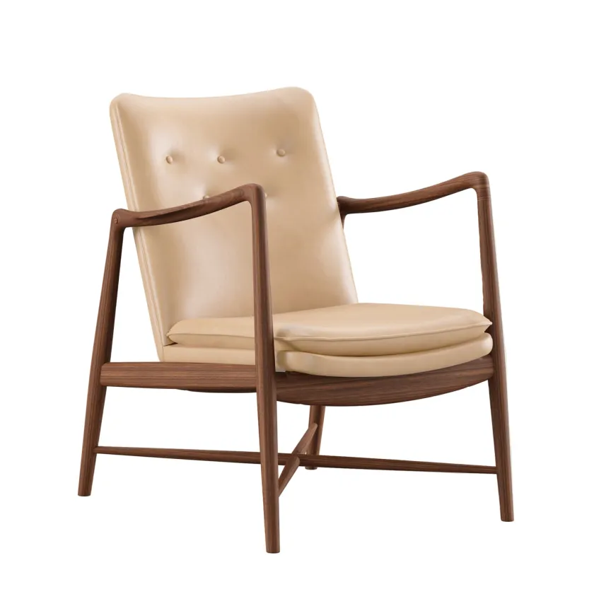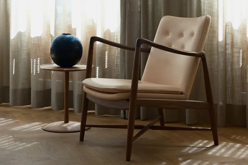 Fireplace Chair indfanger essensen af Finn Juhls organiske formsprog og inviterer til rolige stunder ved ildens skær. De svungne armlæn og den elegante krydsdetalje mellem benene giver stolen et let og skulpturelt udtryk, mens den generøse polstring leverer blød komfort uden at virke tung. Hver stol fremstilles med stor omhu, håndpolstret i Danmark i læder eller tekstil og båret af et massivt træstel i ask eg eller valnød. Resultatet er en tidløs lænestol der passer naturligt ind i både klassiske og moderne interiører og som med sin åbne silhuet bliver et varmt samlingspunkt i stuen.
