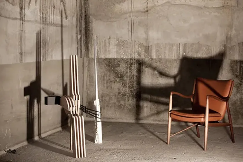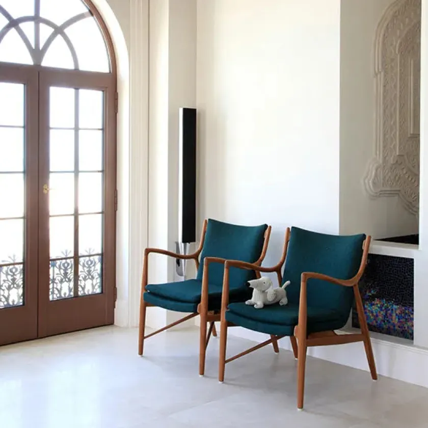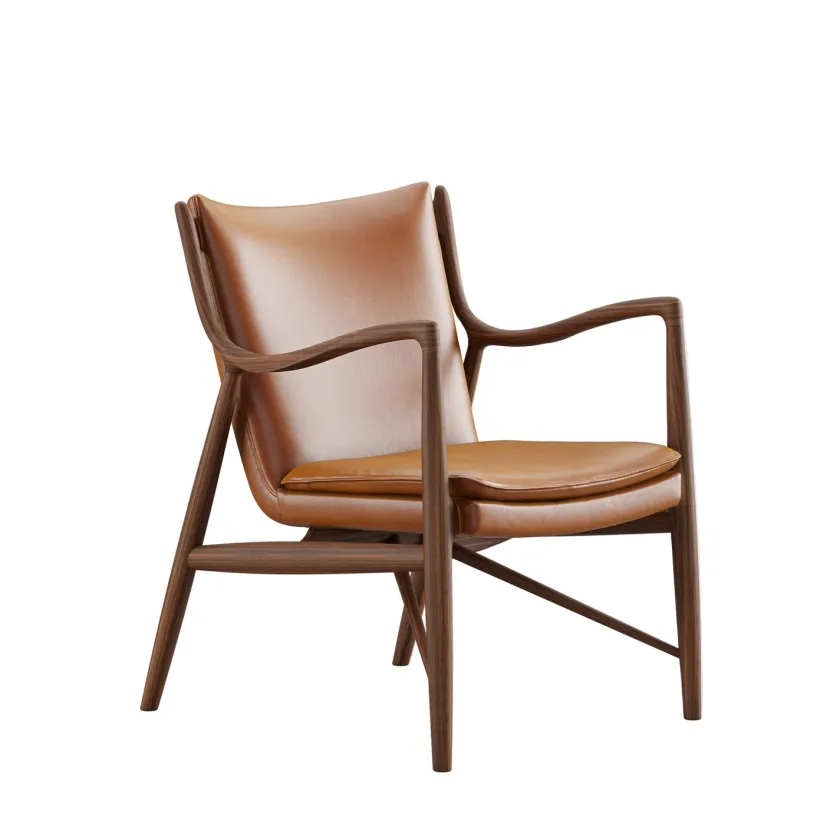 45 Lænestolen af Finn Juhl er et ikonisk værk i dansk designhistorie og anses som et højdepunkt inden for moderne møbelkunst. Stolen blev skabt i 1945 og var på sin tid banebrydende med sine bløde, organiske linjer og den karakteristiske konstruktion, hvor sæde og ryg synes at svæve uafhængigt af rammen. Den er håndlavet i massivt egetræ, behandlet med olie, og betrukket med eksklusivt Elegance-læder. De skulpturelle armlæn og den omhyggeligt udformede ergonomi giver stolen både visuel lethed og fremragende komfort. I dag produceres 45 Lænestolen stadig af House of Finn Juhl med samme dedikation til kvalitet og traditionelt håndværk.