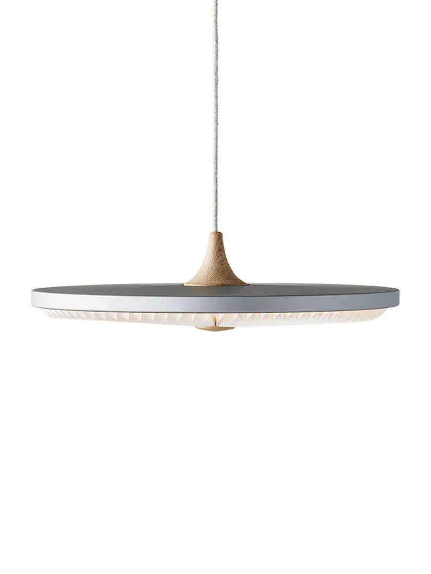 Soleil betyder sol på fransk, og lampen har samme fine egenskaber med en lysspredning som en strålende sol – der spreder lyset fra sit centrum. Le Klint Soleil pendlens slanke design gør den meget anvendelig til at hænge over spisebordet, i restauranten eller mødelokalet. Lampen er uden lysdæmper, men kan benyttes med Casambi lysdæmper, hvor man kan styre lysstyrken via en gratis app/bluetooth på sin mobiltelefon. Soleil kan ikke benyttes sammen med andre allerede installerede lysdæmper-funktioner i boligen. Mål: Diameter: Ø 50 cm. Højde: 6 cm. Farve: Silver Cloud Træsort: Røget eg Skærm: Standard (plast) Model: 198 Designet af: Philip Bro Ludvigsen
