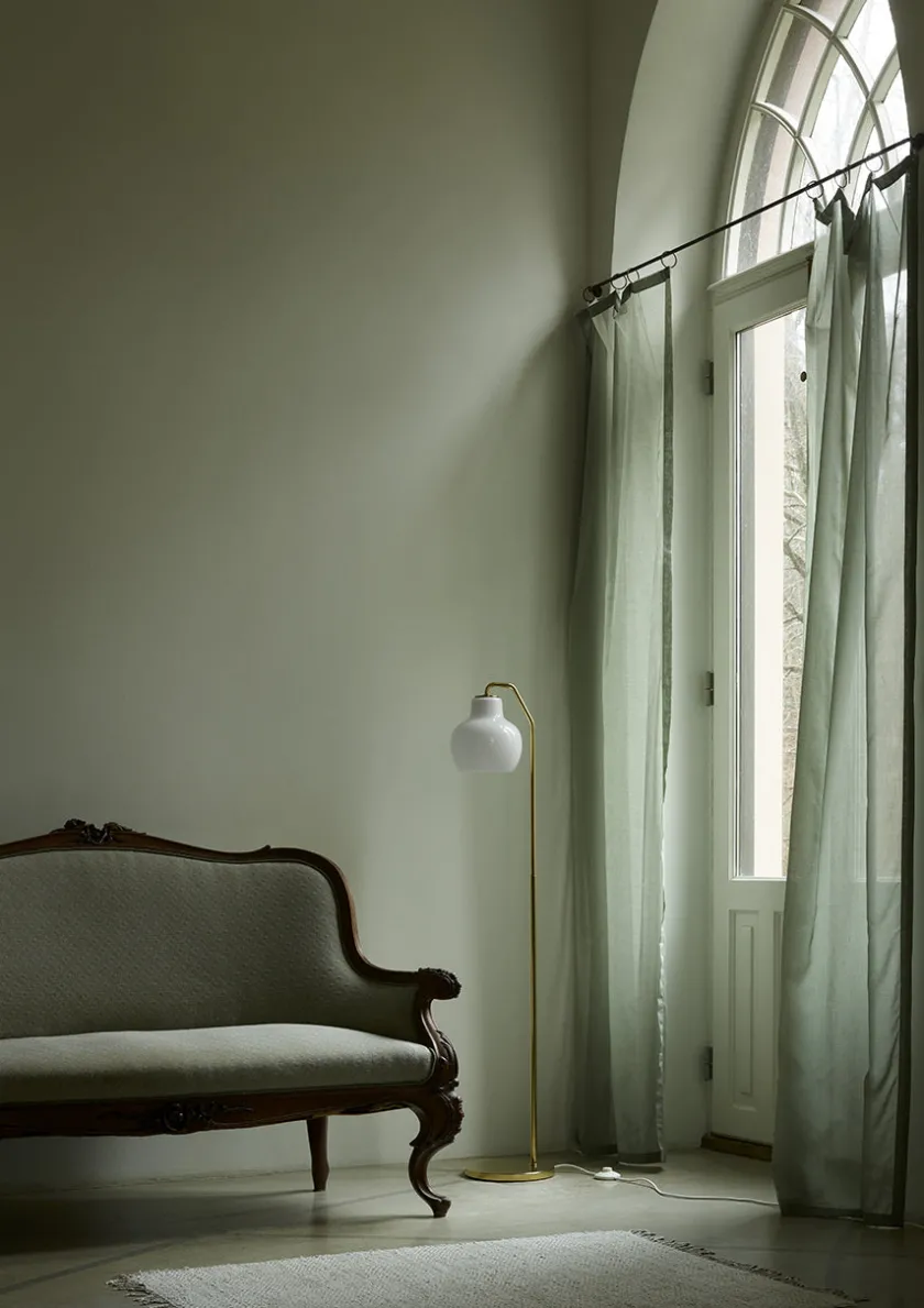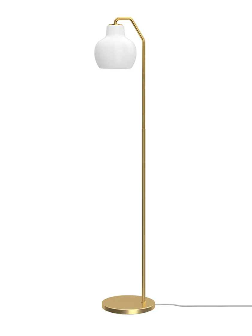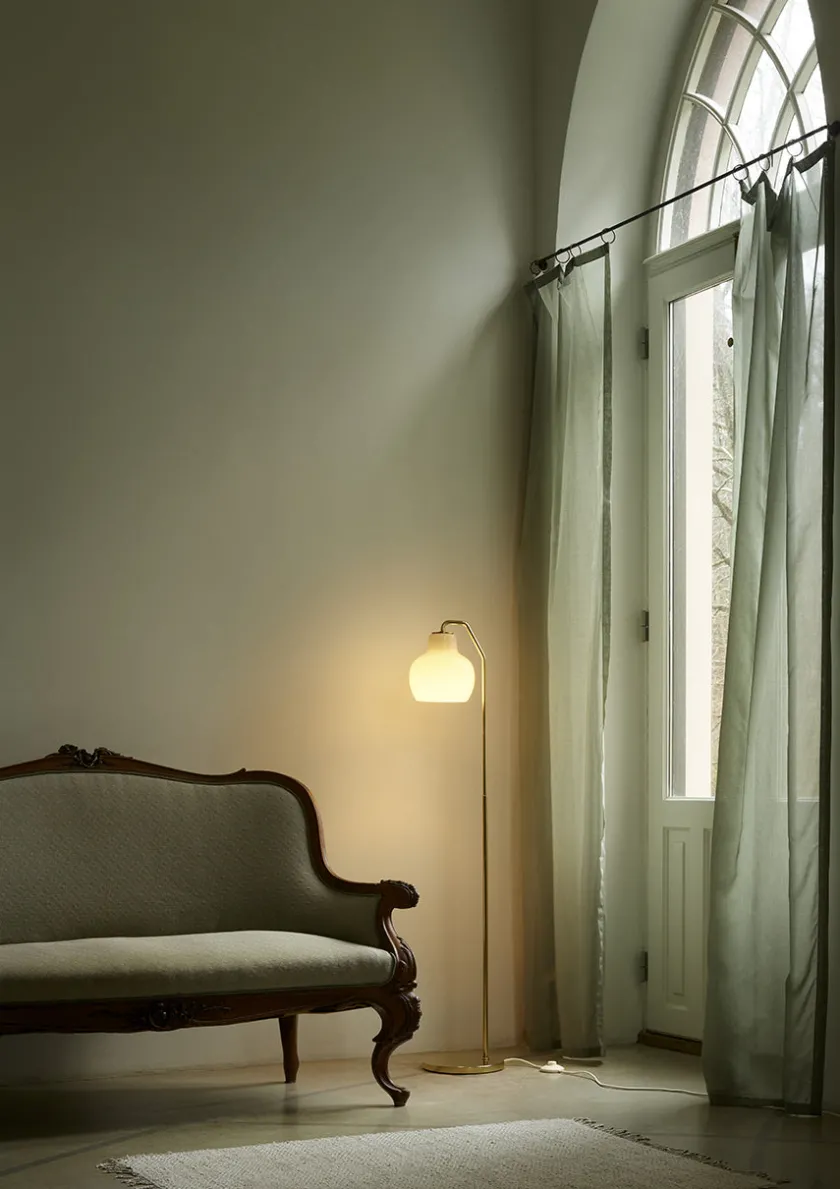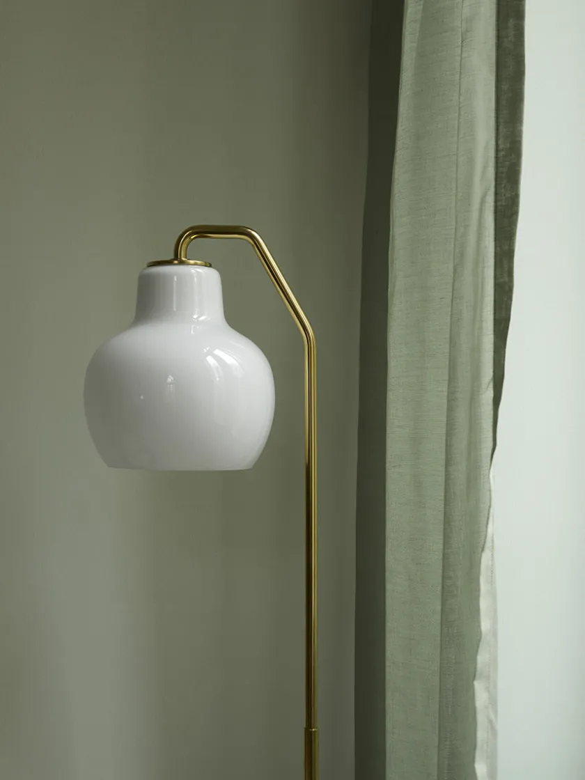 Skærmen er fremstillet i trelags, mundblæst opalglas, der udsender et blødt, diffust lys med behagelig afskærmning. Lyset rettes primært nedad og skaber en varm og stemningsfuld belysning omkring lampen. Gulvlampen har en messingfod med en smuk satin-finish. Messingen er ubehandlet og vil patinere naturligt over tid.