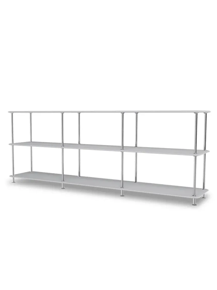Montana Free reolsystemet er opbygget af lakerede MDF-hylder i dybde 38 adskilt af tynde stager i krom, der giver et let og svævende udtryk og understreger de horisontale hylder.