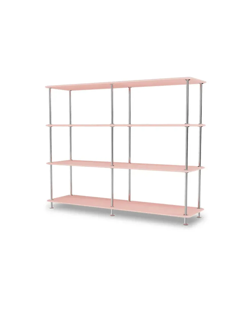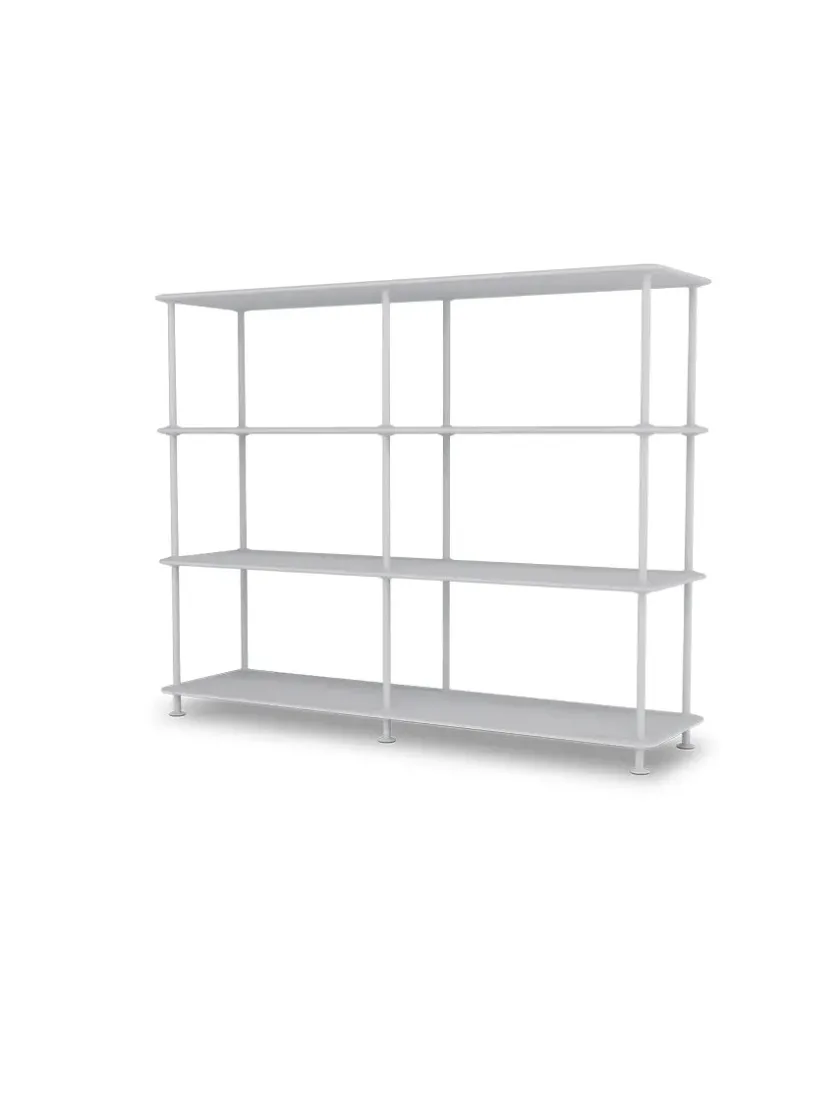 Montana Free reolsystemet er opbygget af lakerede MDF-hylder i dybde 38 adskilt af tynde stager i krom, der giver et let og svævende udtryk og understreger de horisontale hylder.