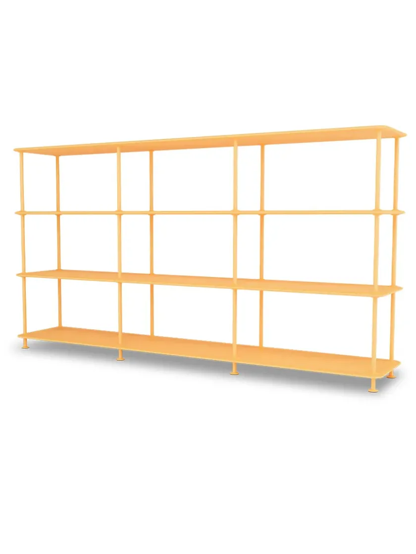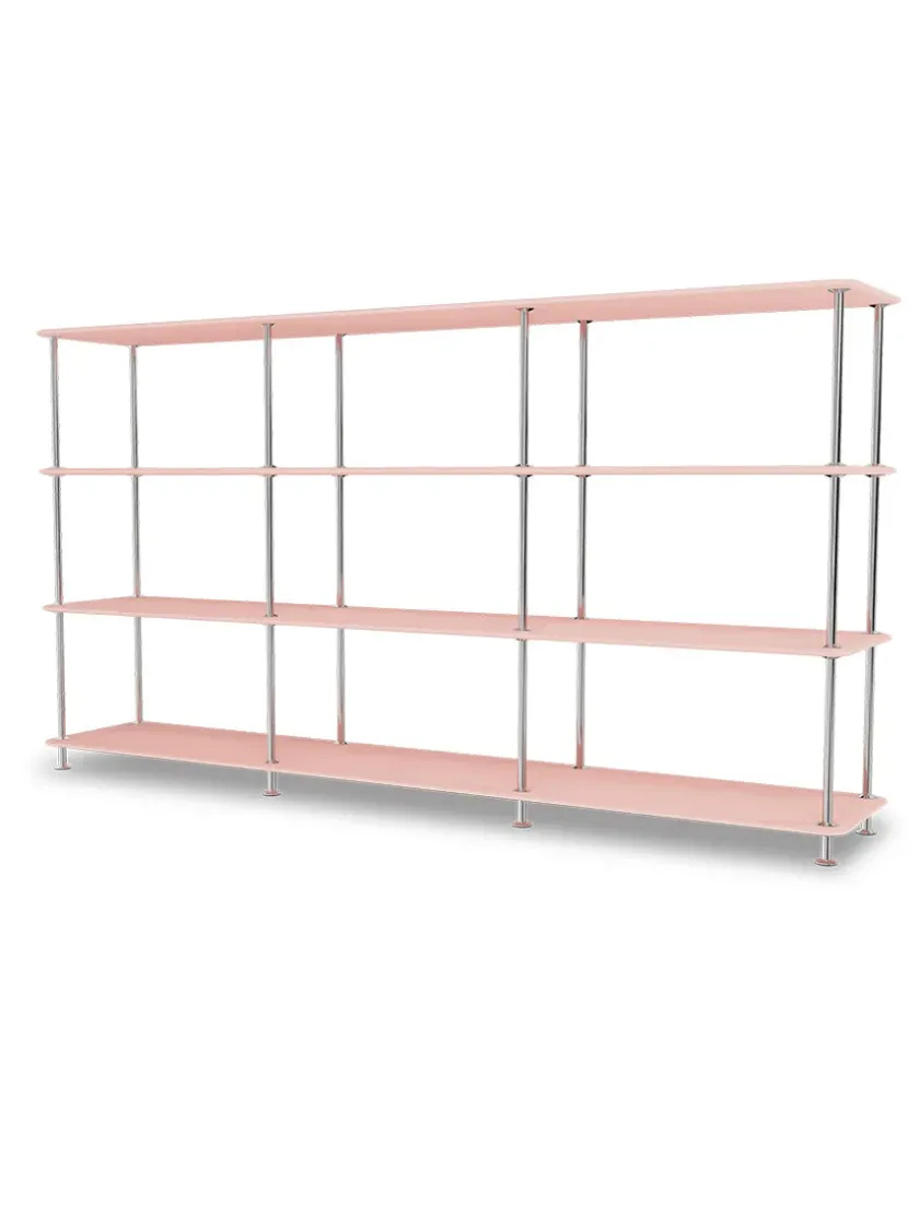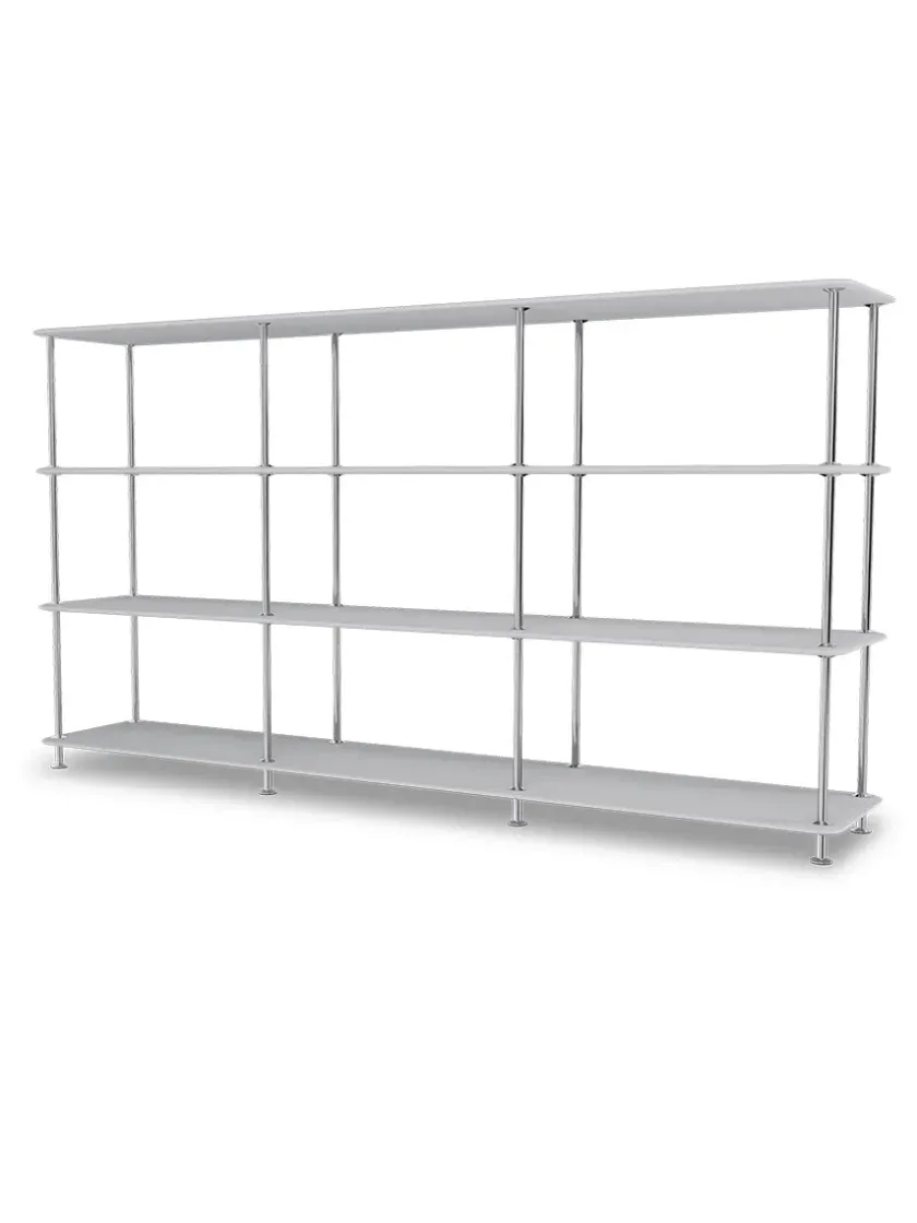 Montana Free reolsystemet er opbygget af lakerede MDF-hylder i dybde 38 adskilt af tynde stager i krom, der giver et let og svævende udtryk og understreger de horisontale hylder.