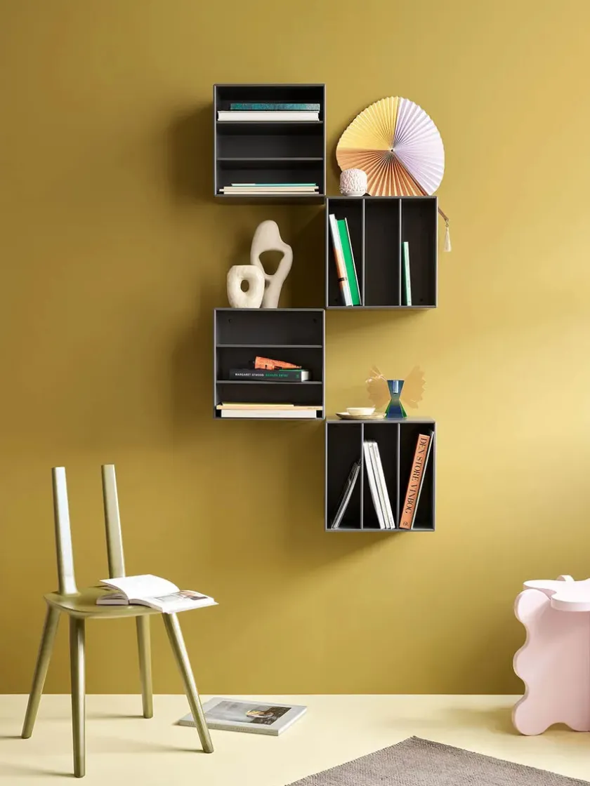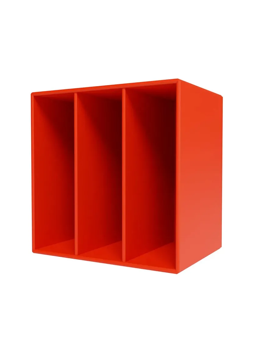 Montana Mini er en serie med mindre opbevaringsmoduler, som laves i 10 forskellige farver. Her finder du modulet med to skillevægge, som giver tre rum vertikalt, med gode muligheder for opbevaring af diverse ting, eksempelvis i soveværelset, entréen eller stuen. Serien laves af 8 millimeter MDF modsat de 12 millimeter, som resten af Montanas reoler. Ophæng medfølger.