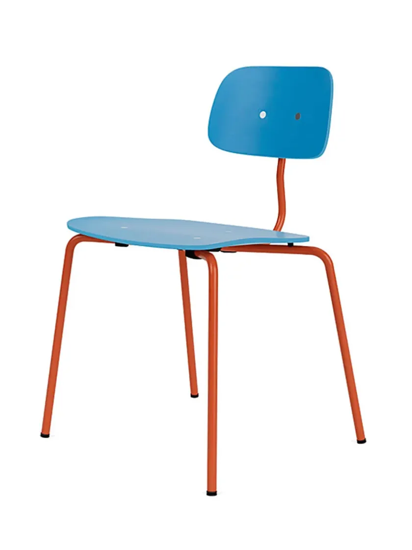 Denne variant af Kevi 2060 stolen er i Azure, med mulighed for at vælge stellet 9 forskellige farver. Den stabelbare spisestol er designet af Jørgen Rasmussen og fås med sæde og ryg i eg eller lakeret.