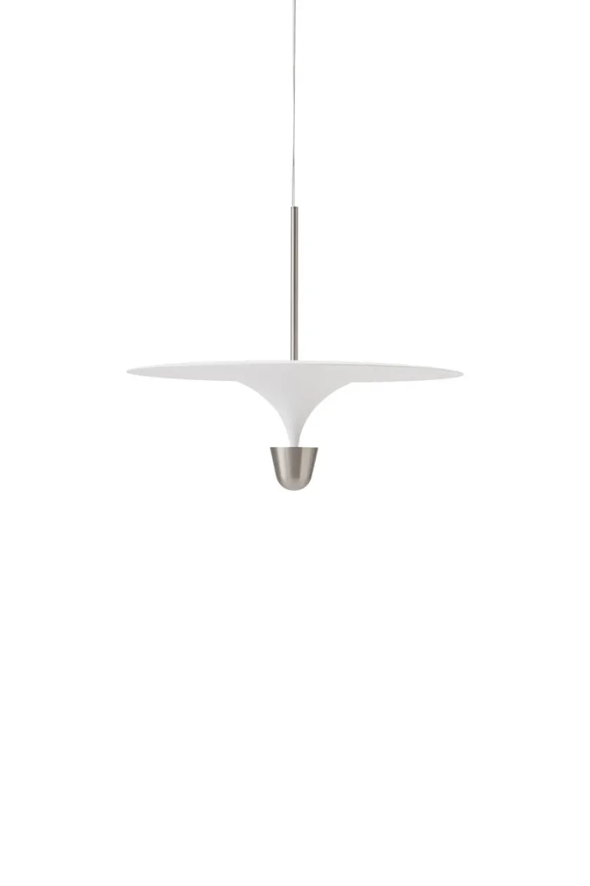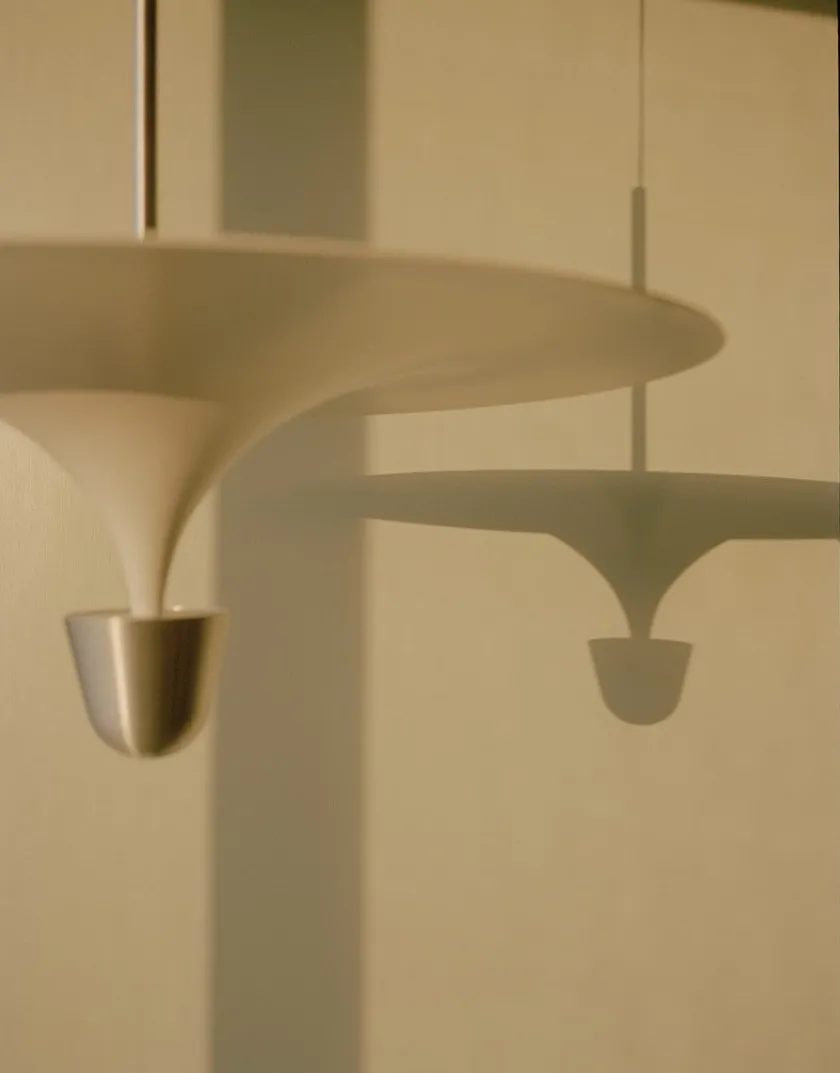 Kantarell Ø60 er en skulpturel pendel af Falke Svatun, formet som en blid tragt der leder lyset fra den næsten skjulte lyskilde i centrum. Den klare, grafiske silhuet gør lampen lige smuk højt som lavt og fremhæver både den svungne underside og den bløde top. Med sin brede, blændfrie lysfordeling er Kantarell ideel over spisebordet, i stuen eller i større rum, hvor den definerer rummet så meget, som den belyser det. En moderne klassiker i ærlige materialer, for dig der ønsker ro, stoflighed og nordisk enkelhed i indretningen.