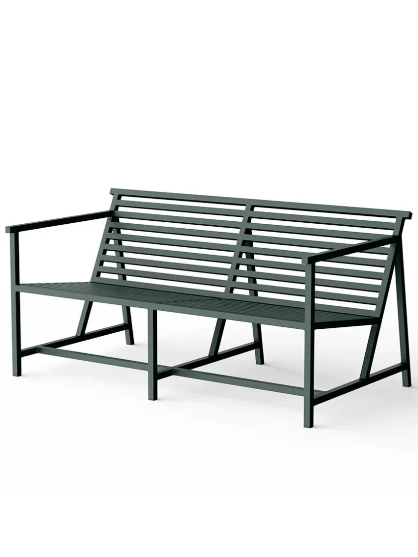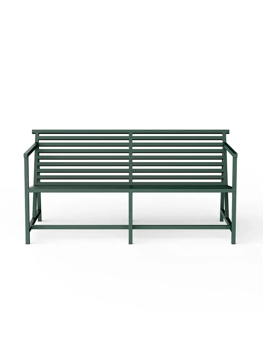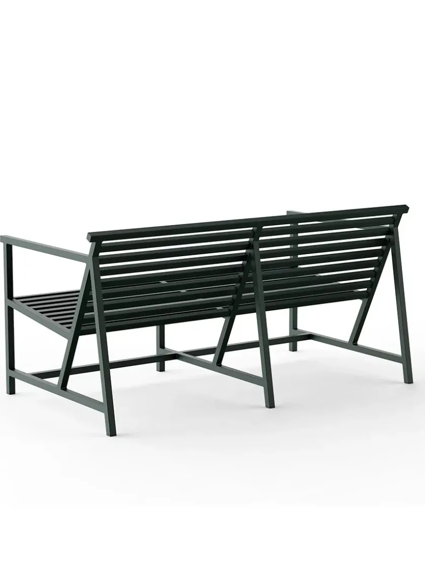 Grøn loungebænk fra danske 19 Outdoors. Bænken er lavet af aluminium og er pulverlakeret i en mørk grøn farve. Bænken kan tåle at tå ude og er derfor et flot element at tilføje til møbleringen udenfor.