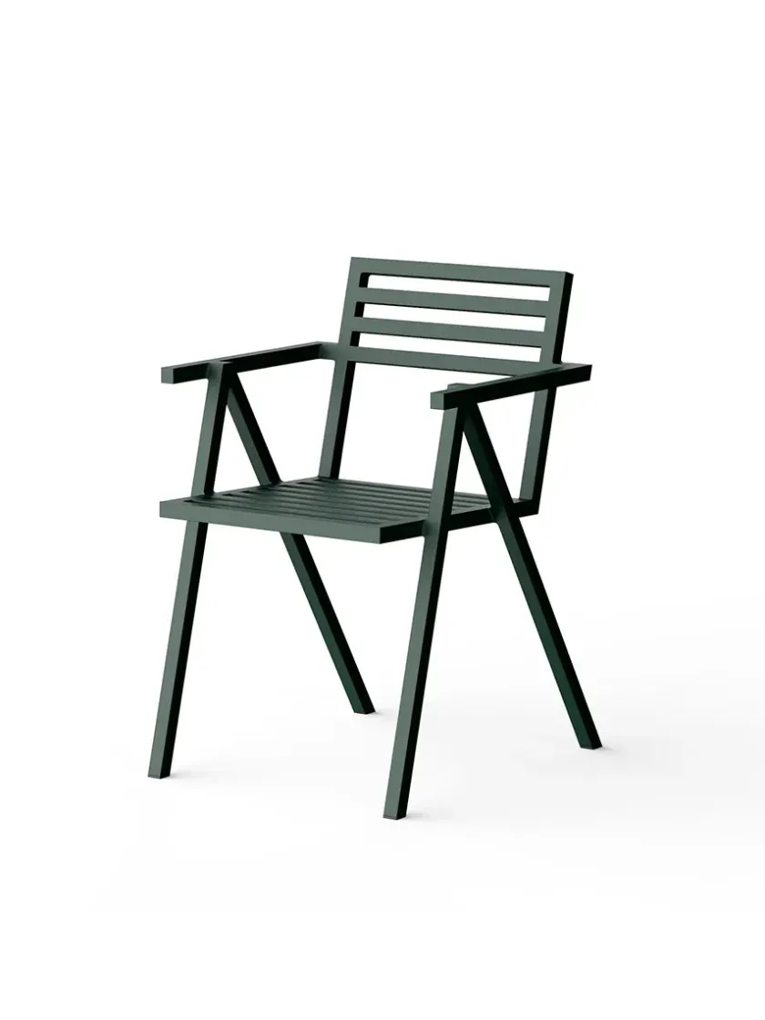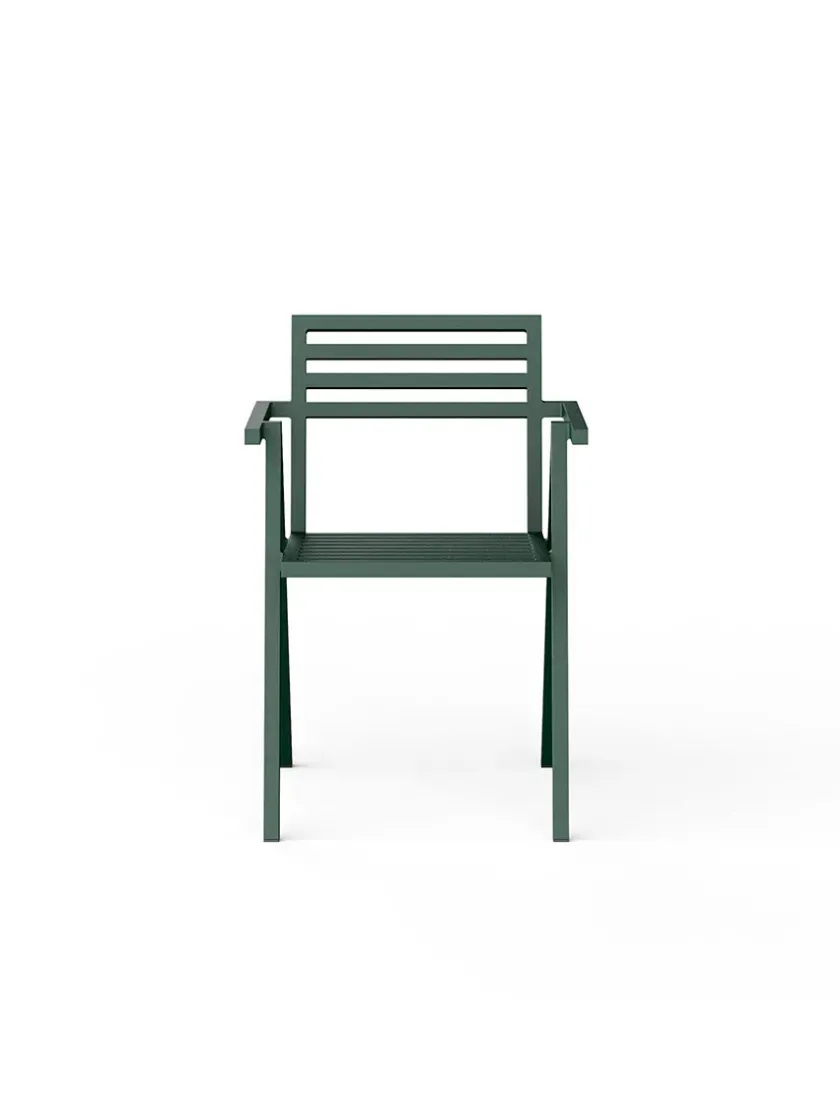 Havestol med armlæn fra 19 Outdoors i mørk grøn. Stolen er lavet i aluminium og er pulverlakeret. Den æstetisk flotte og enkle stol har den praktiske funktion, at den kan stables, så den er let at pakke væk om vinteren og ikke fylder meget. Designet på Stacking Chair fra 19 Outdoors er super enkelt og stilfuldt.