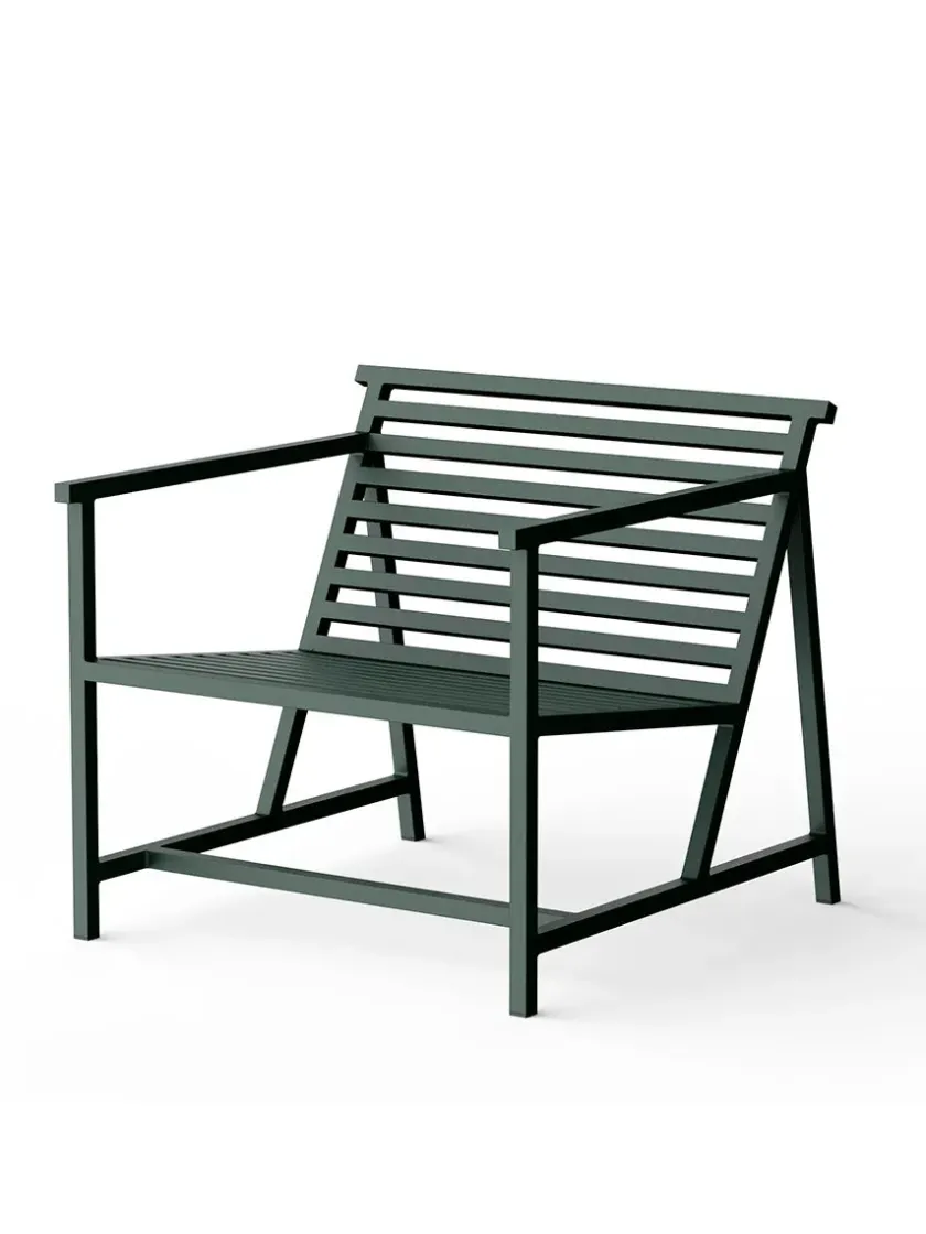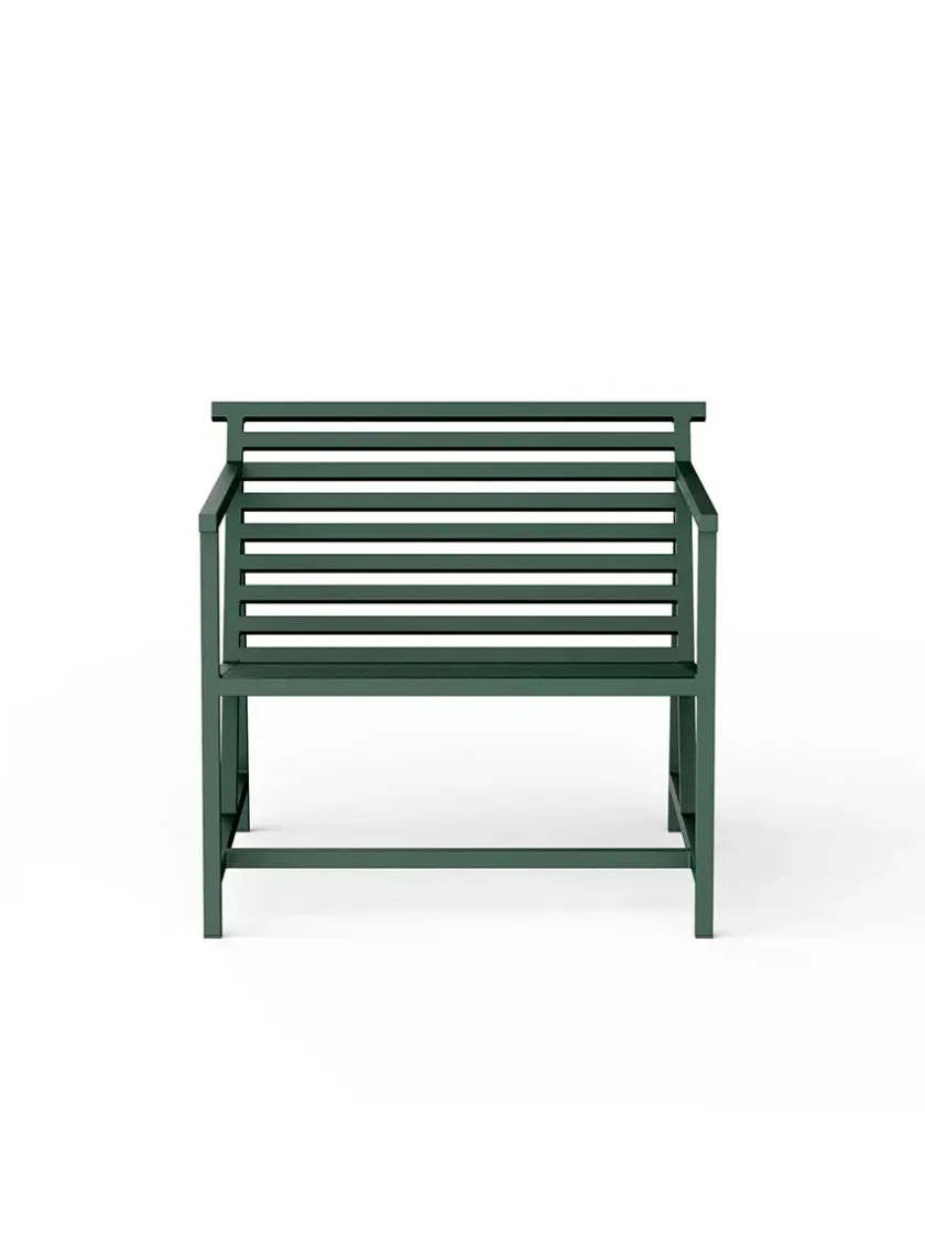 Grøn lounge stol fra 19 Outdoors. Stolen er lavet af aluminium og er pulverlakeret grøn. Den æstetisk flotte og enkle stol er perfekt til haven eller terrassen og kommer med plastik bendupper