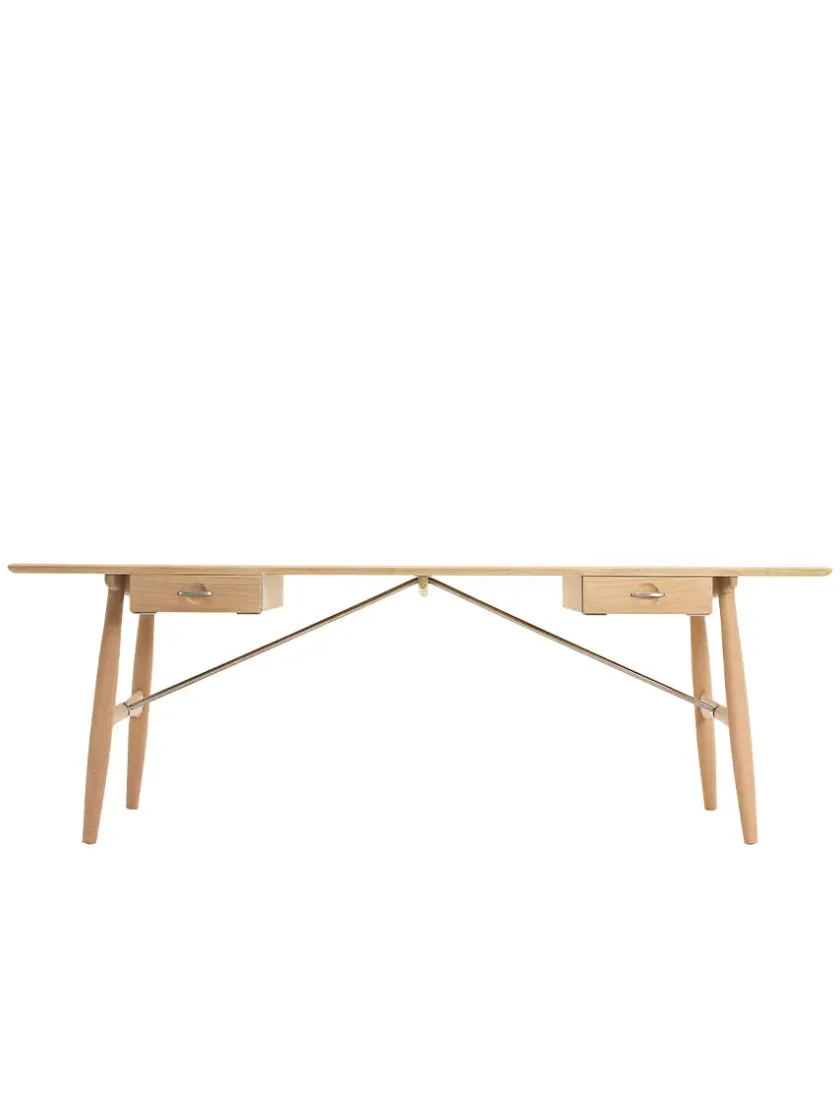PP571, også kaldet Arkitektens Skrivebord, er et elegant skrivebord designet af Hans J. Wegner i 1953. Bordet er et smukt eksempel på dansk design, hvor funktionalitet og æstetik smelter sammen i et enkelt, men karakteristisk formsprog. Skrivebordet er fremstillet i egetræ, og bordpladen er af træ fra én stamme. Bordpladen bæres af slanke, polerede stålstænger, der tilføjer en moderne kontrast til det varme træ og understreger Wegners minimalistiske designfilosofi. Bordet har to rummelige skuffer med unikke, fræsede greb i rustfrit stål og låsemekanismer, der kombinerer funktionalitet med et eksklusivt udtryk.