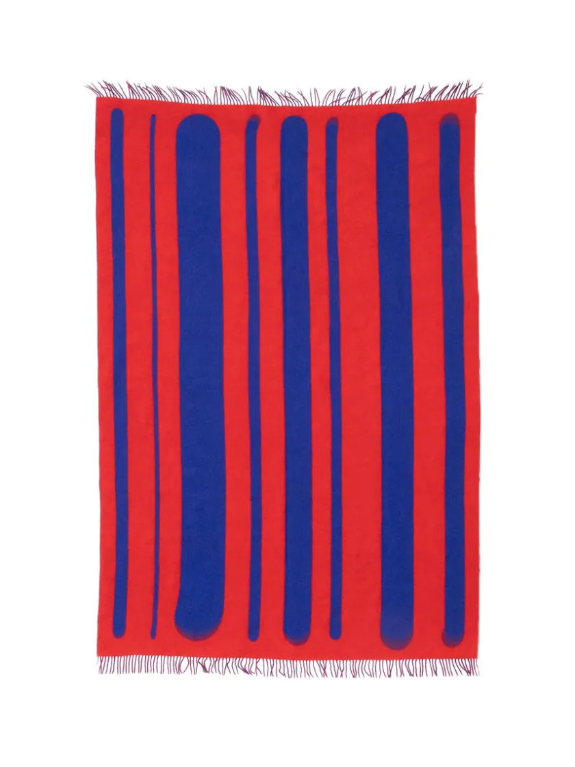 De moderne Brush plaider kommer i tre forskellige farver. Her er tæppet i farven blue/red. Tæppet vil med sine farver og de små frynser i enderne pynte både i stuen og soveværelset. Plaiden vil være et ekstra statement i indretningen med de blå og røde farver.