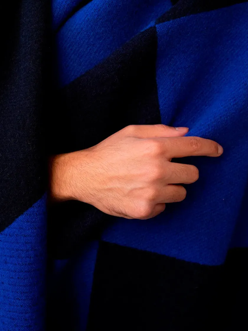 De moderne Patch plaider kommer i fire forskellige mønstre og farver. Her er tæppet i farven blue/green/navy. Tæppet vil med sine store tern og de små frynser i enderne pifte både stuen og soveværelset op.