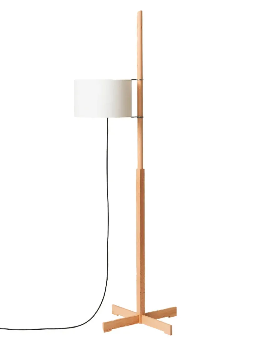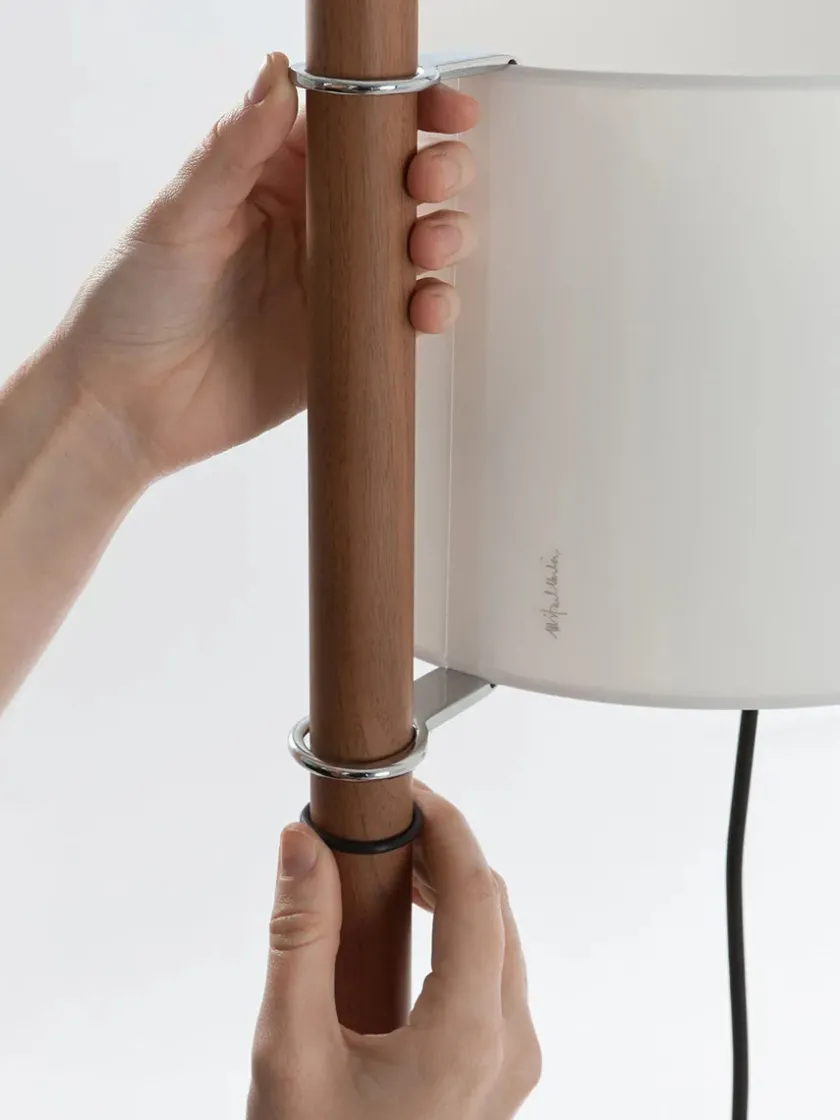 TMM er en lampe, der kan tilpasses efter dit behov. Lampen kombinerer på smukkeste vis det industrielle design med enkelthed. Det lette udtryk gør at gulvlampen kan bruges i flere typer af indretninger, uanset om det er en moderne eller klassisk indretning. Stellet er af valnød og skærmen er fremstillet af hvid eller beige pergament. Den krydsformet base understøtter det firkantet skaft, der bliver cirkulært ved midten, der gør det muligt at flytte skærmen op eller ned. Skærmens højde kan justeres ved hjælp af et gummibund på skaftet.