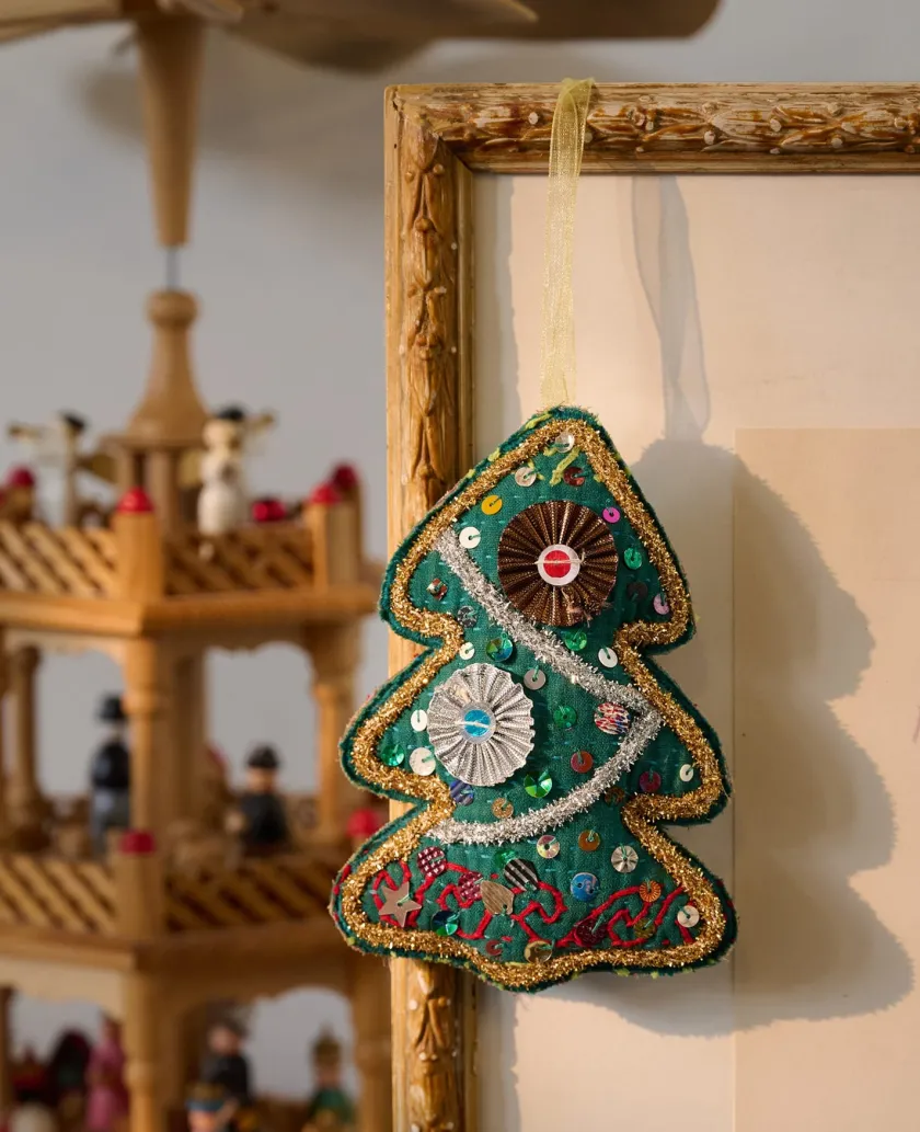 Skab en magisk og personlig julestemning med det smukke Glitter Tree Ornament fra Sissel Edelbo. Hvert ornament er håndlavet af vintage kantha-tæpper og unikt dekoreret med glitrende pailletter, fine rosetter og sølvbånd. De gyldne lurex-detaljer langs kanten tilføjer et elegant, funklende udtryk, der får juletræet til at stråle.