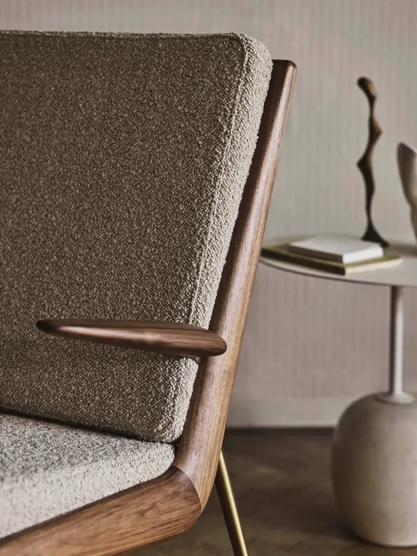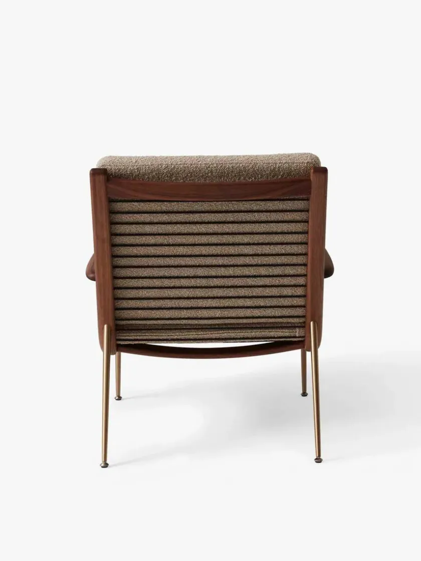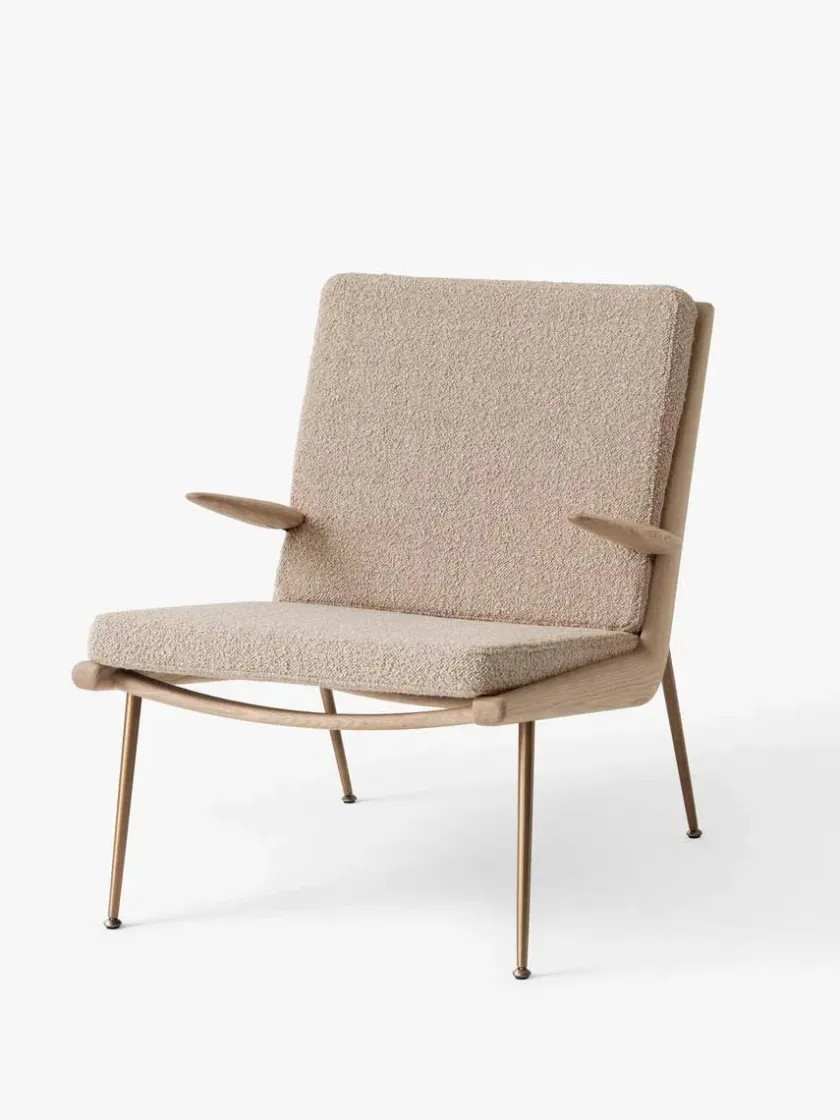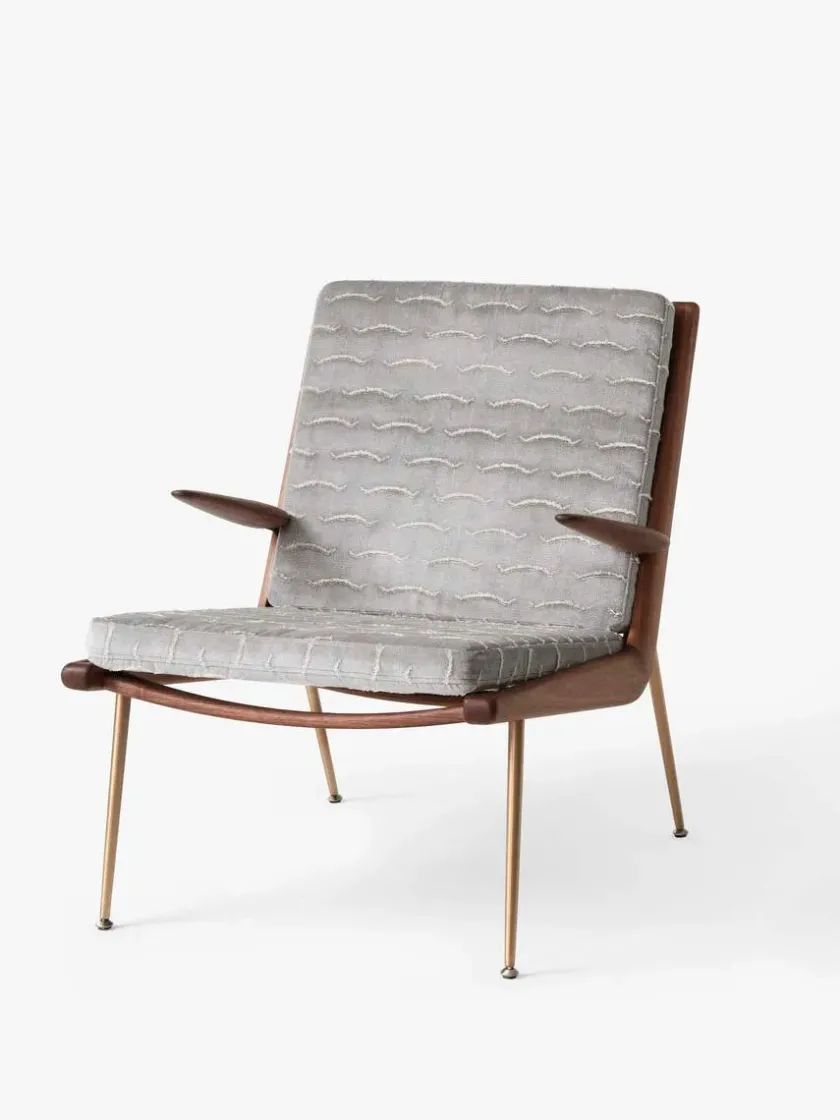 Boomerang lænestolen fra 1956 er designet af Hvidt & Mølgaard og laves nu af &Tradition. Vælg HM2 med armlæn i mange forskellige stoftyper med stel i eg eller valnød med ben i messing.