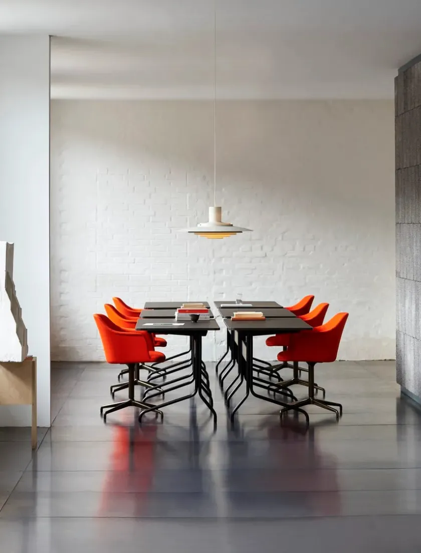 Pavilion AV16 skrivebord er tegnet af design duoen Anderssen & Voll i 2020. Det fine skrivebord er lavet med en linoleum bordplade med kant i eg eller valnød finér. Stellet er lavet i stål.