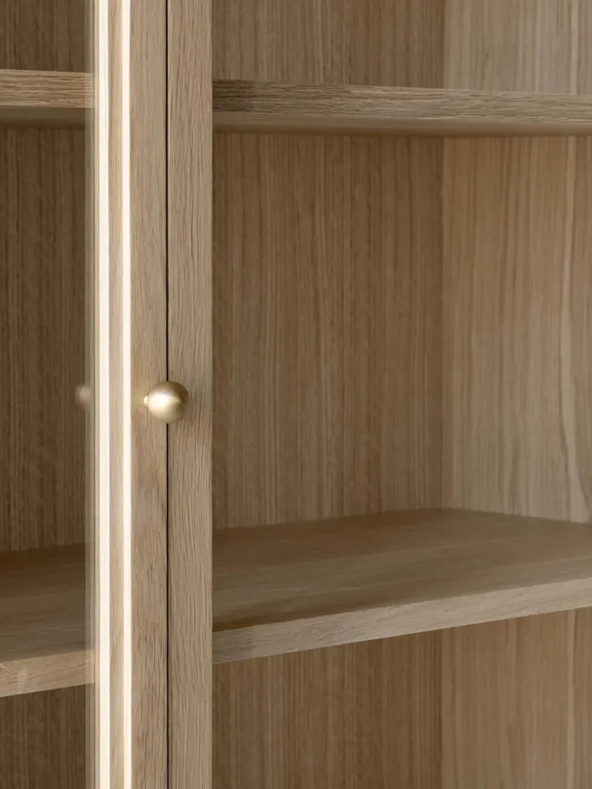 Det smukke og anvendelige vitrineskab Trace fra &Tradition er klassisk i sit udtryk, og vil kunne fungere perfekt til at vise små og store ting frem i. Vitrinen er designet af dygtige Space Copenhagen, som er eksperter i at forene nutidigt med klassisk. Trace fås både som single cabinet eller som double cabinet og i enten eg med messinghåndtag eller i mørkbejdset eg med brunerede håndtag.