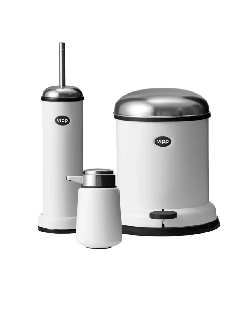 Giv dit badeværelse et stilfuldt løft og opgrader det med dette attraktive Vipp-sæt, der indeholder tre af mærkets mest populære og funktionelle produkter i en elegant hvid farve. Uanset om du ønsker at erstatte en gammel toiletspand, toiletbørste eller sæbedispenser, vil dette sæt sikre, at dit badeværelse får et frisk og moderne look. Sættet indeholder (i hvid): 1 x . 1 x . 1 x . Materiale: Pulverlakeret stål, rutfrit stål og silikone. Ud over at tilføje et strejf af elegance til dit badeværelse, er Vipp-sættet også nemt at rengøre og vedligeholde, hvilket gør det til et praktisk valg for travle husholdninger.