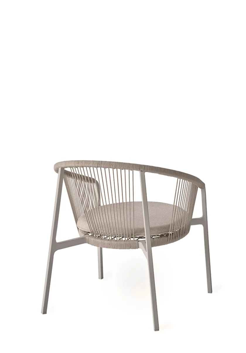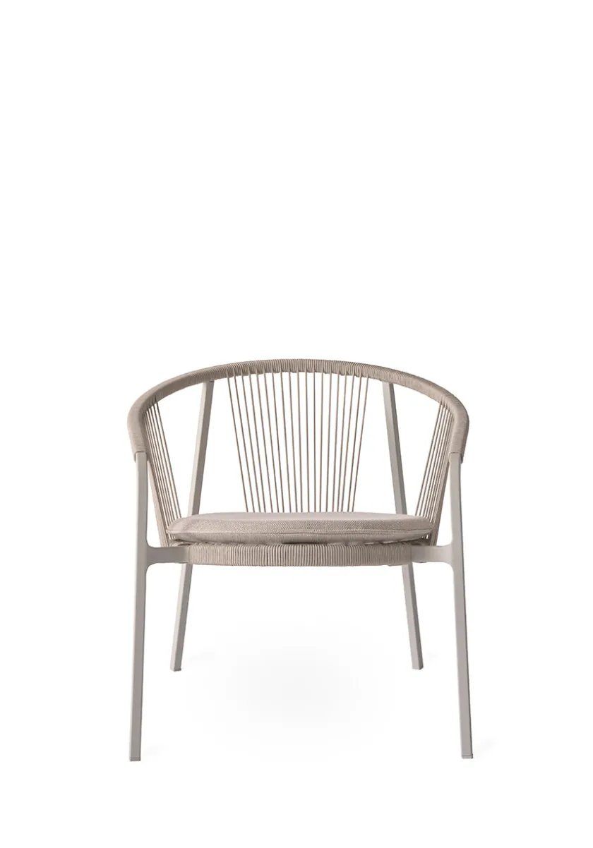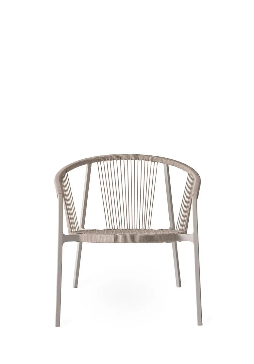 Stolens lette og robuste ramme i pulverlakeret aluminium omkranses af flettet reb, der tilfører en luftig og dekorativ detalje. Overfladen er modstandsdygtig over for ridser og falmning, hvilket sikrer et langtidsholdbart udtryk.